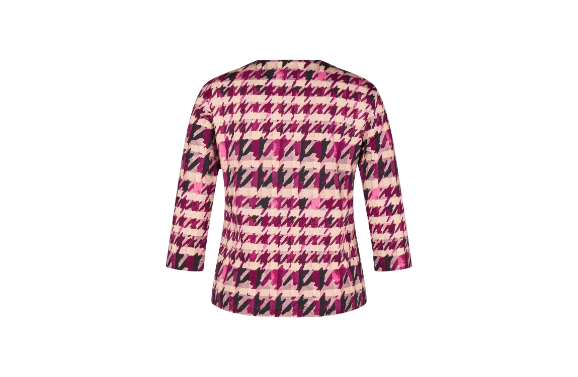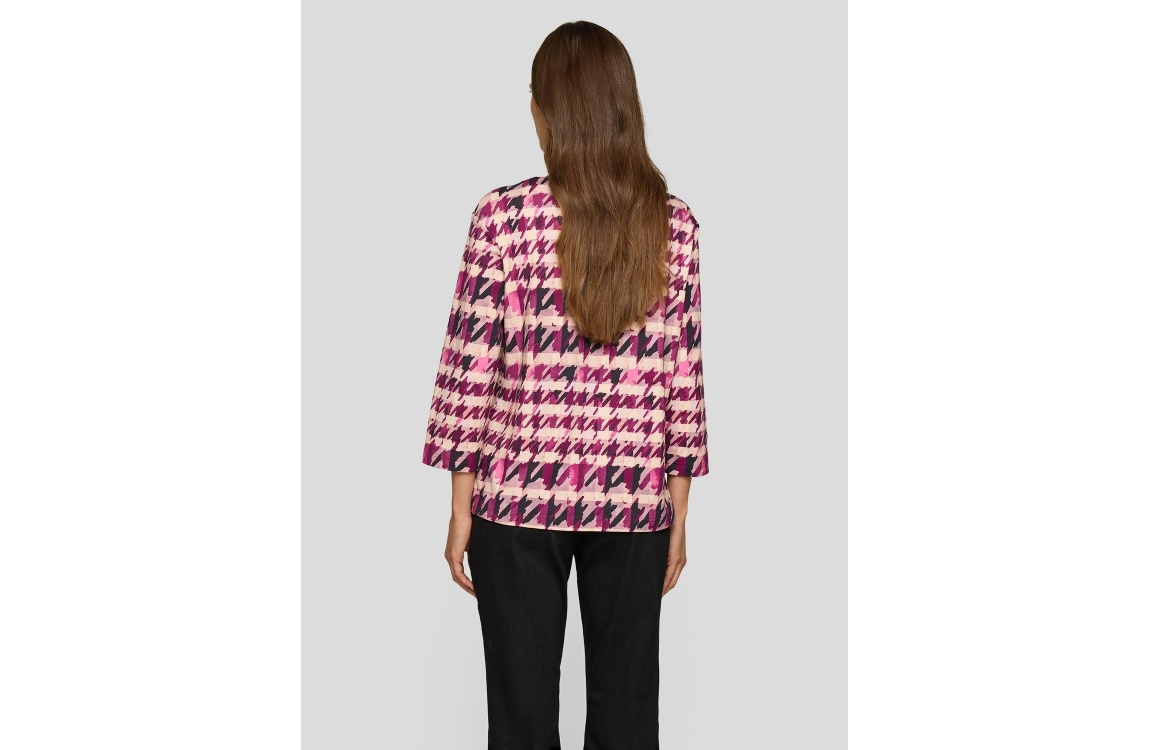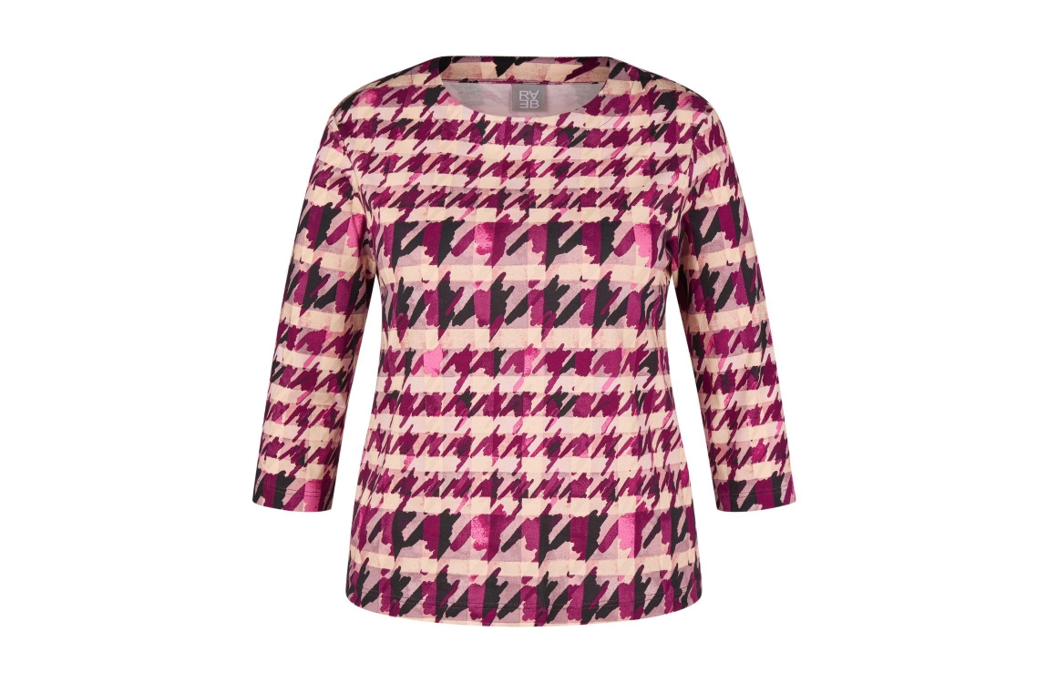 Rabe T-Shirt 5287 Pflaume. Dit rechtvallende model is voorzien van een ronde hals en driekwart mouwen. Deze paarse pullover van Rabe is all-over bewerkt met een grafische print.
