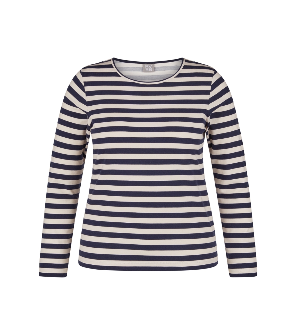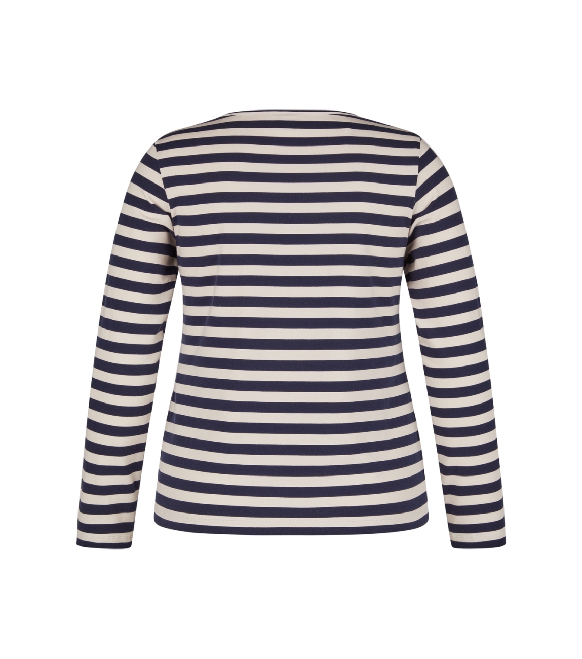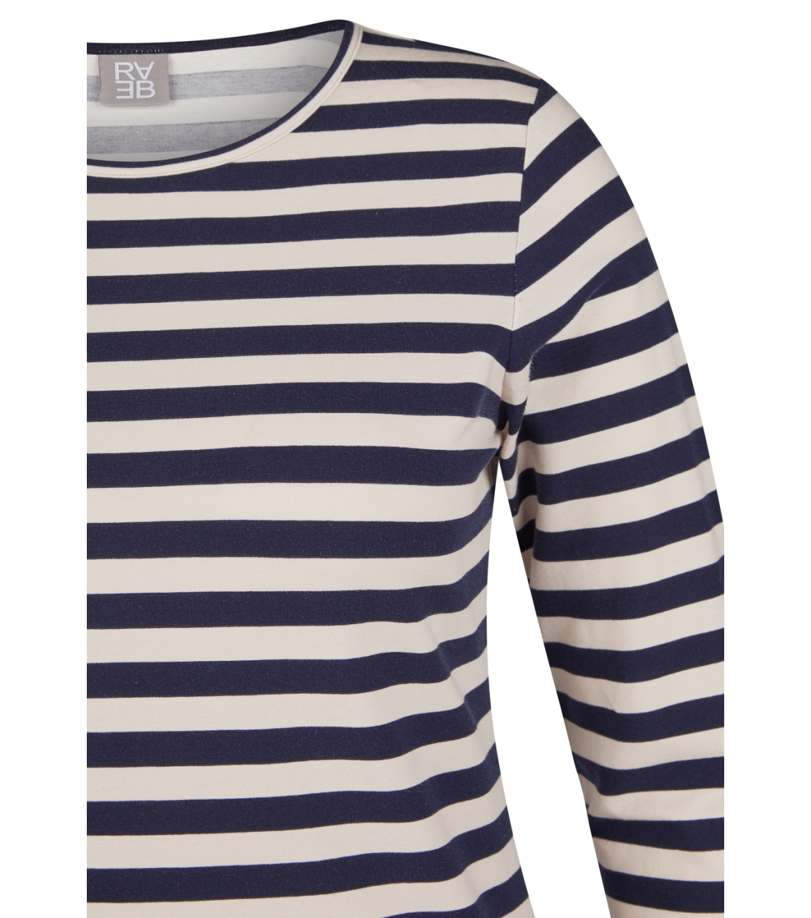 Rabe shirt 55-123350 5374. Dit rechtvallende model heeft een ronde halslijn en lange mouwen. Deze donkerblauwe shirt van Rabe is all-over bewerkt met een streepprint en is uitgevoerd in stretchkwaliteit.