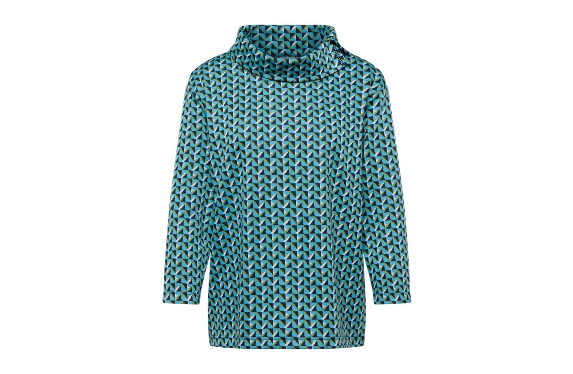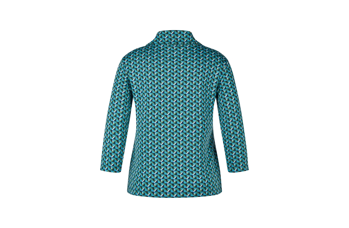 Rabe shirt 55-123362 5374. Dit rechtvallende model heeft een col, gedetailleerd met een splitdetail en strass-steentjes en beschikt over driekwart mouwen. Deze donkerblauwe shirt van Rabe is all-over bewerkt met een grafische print in verschillende kleuren en bevat lichte stretchkwaliteit.