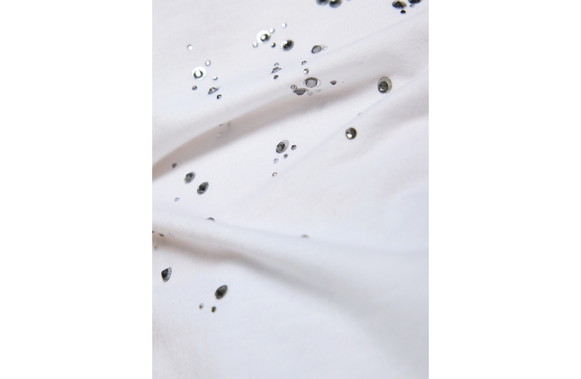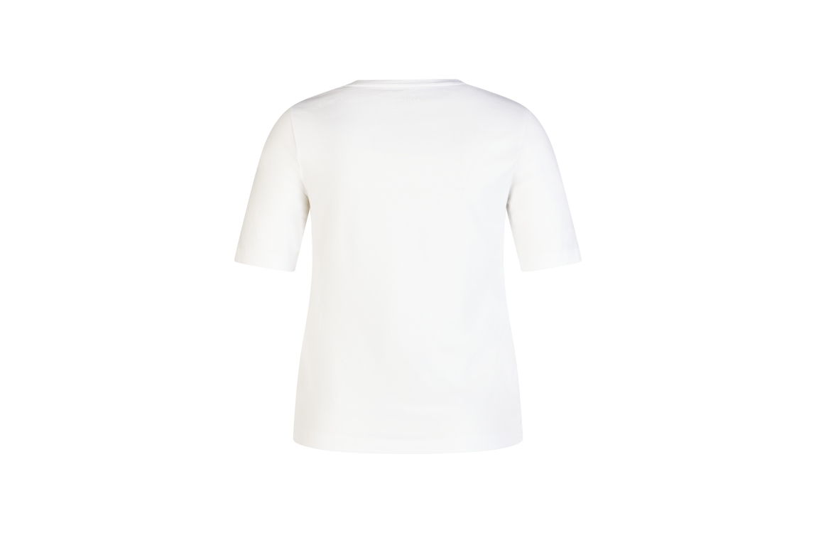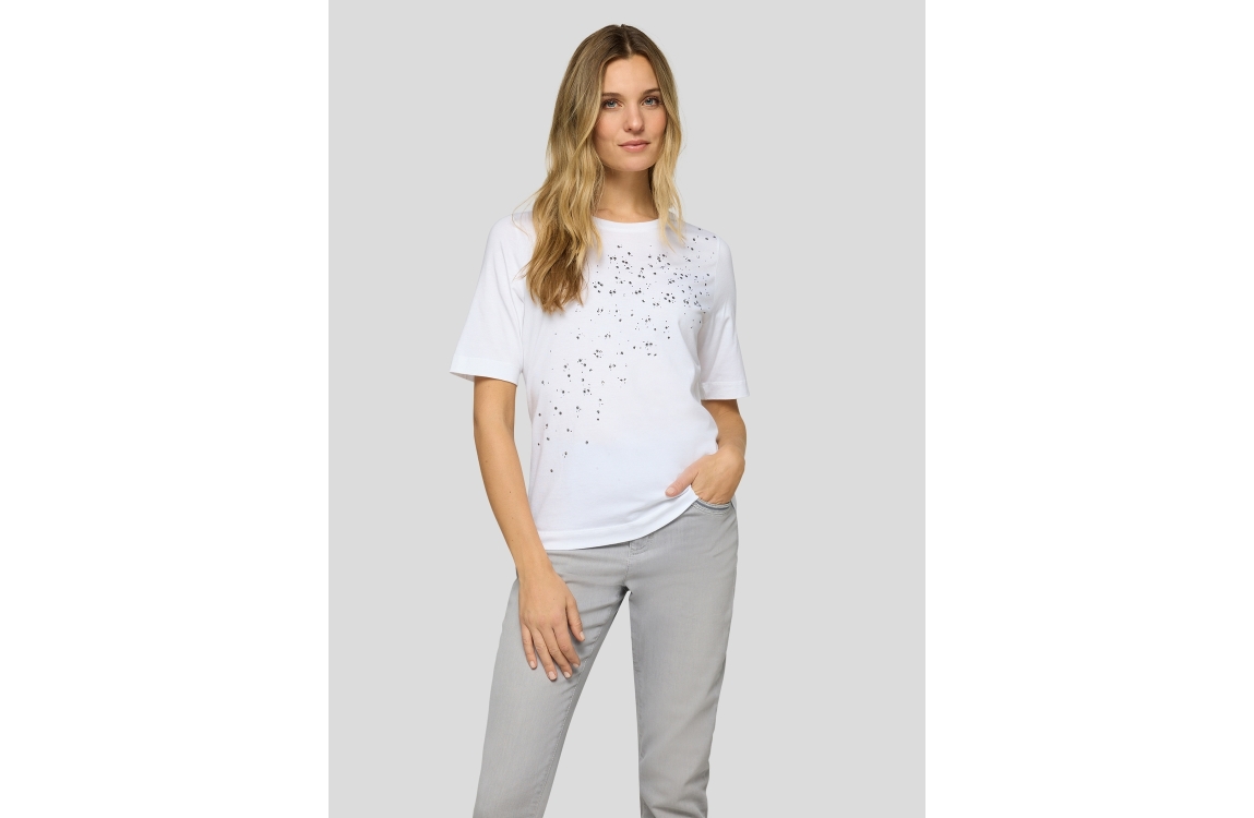 Rabe T-Shirt 6003 weiss. Dit rechtvallende model is voorzien van een ronde hals en heeft korte mouwen. Deze witte shirt van Rabe is bewerkt met steentjes op de voorzijde.