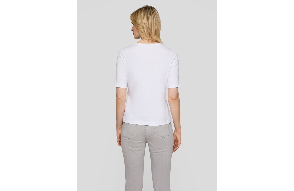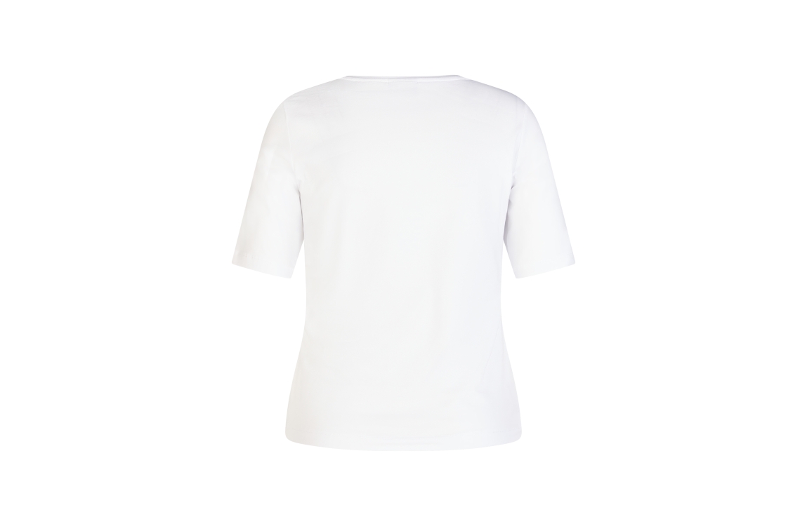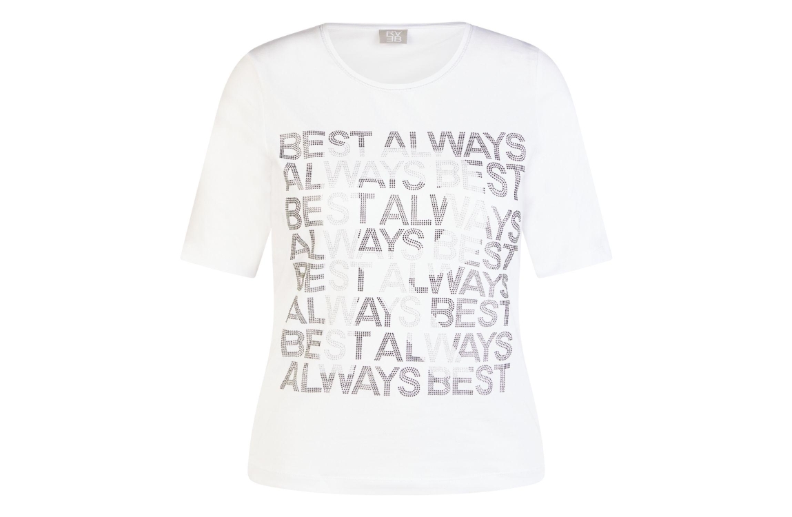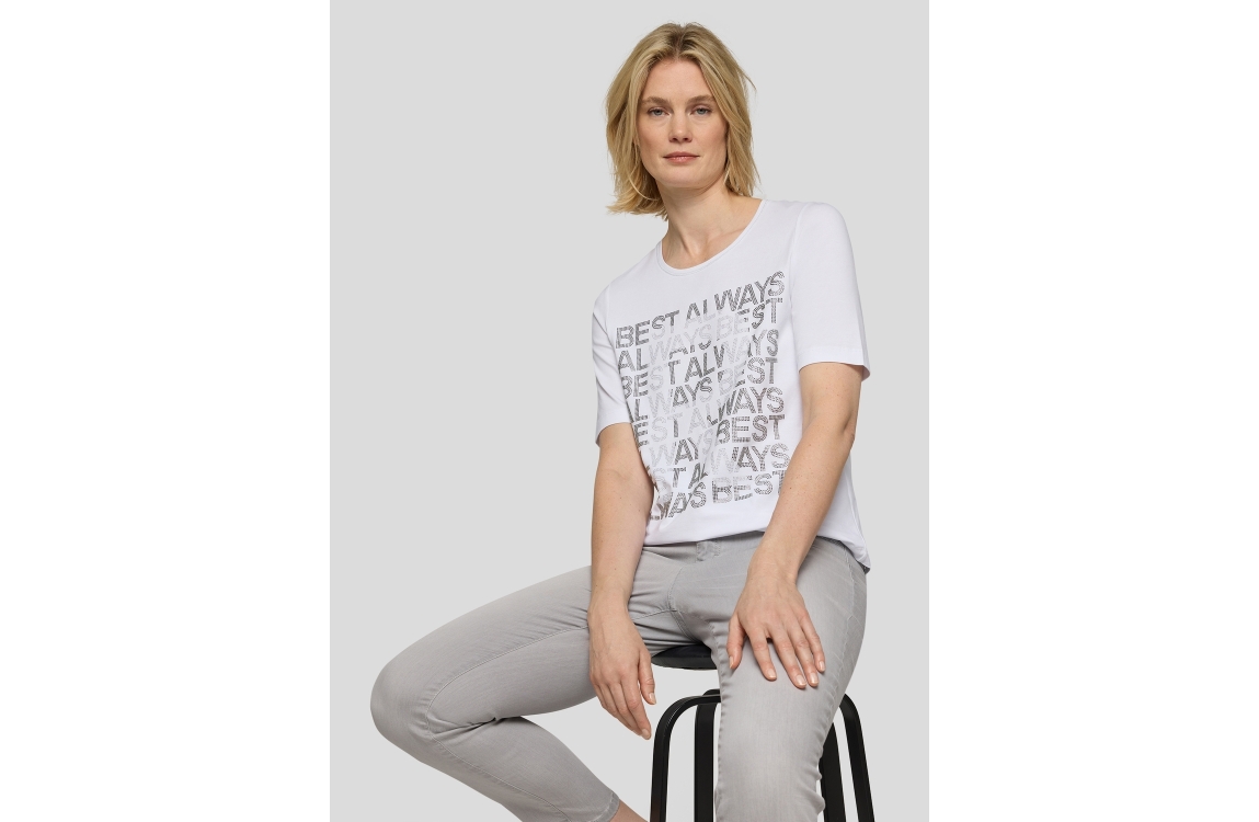 Rabe T-Shirt 6003 weiss. Dit rechtvallende model is voorzien van een ronde hals en heeft korte mouwen. Dit witte T-shirt van Rabe is bewerkt met een teskt opdruk van strass steentjes op de voorzijde.