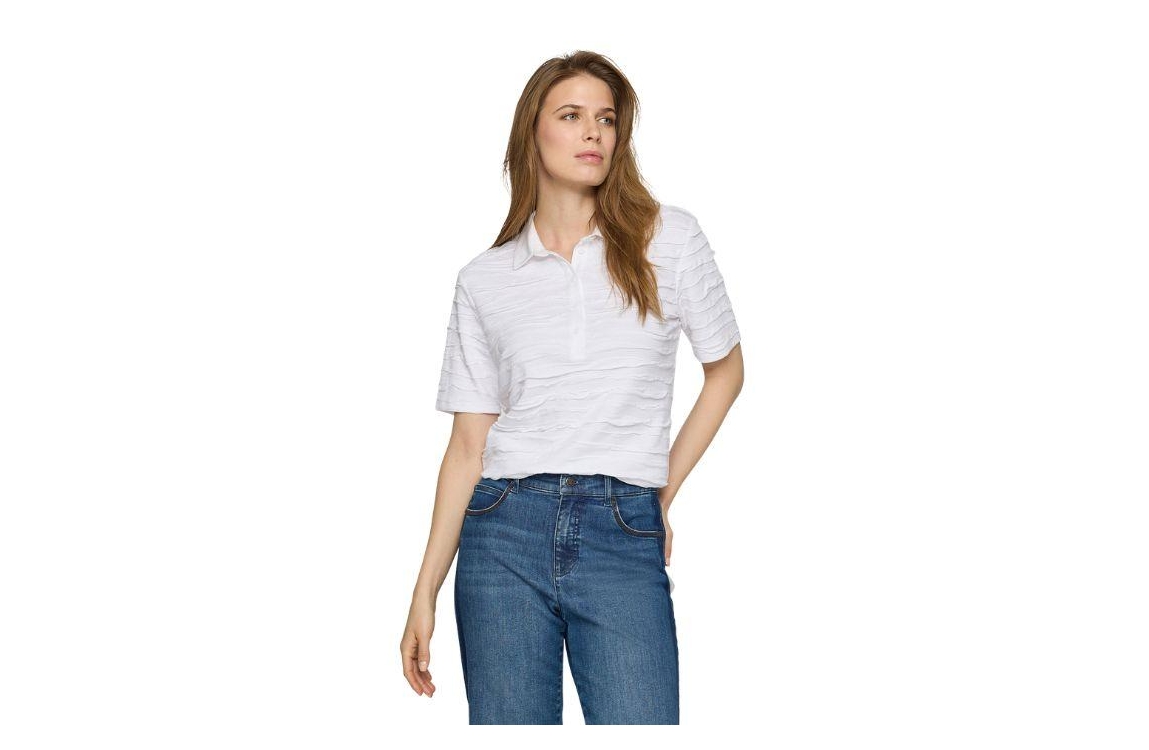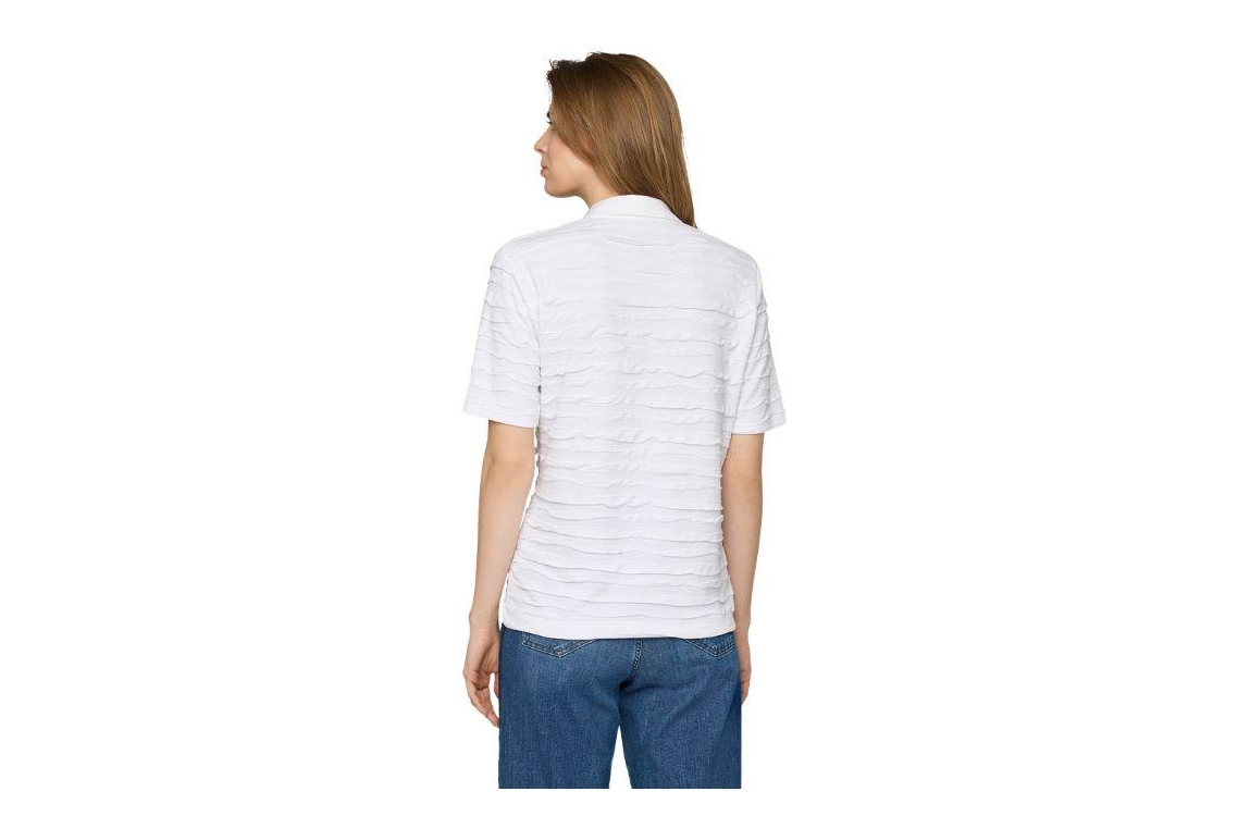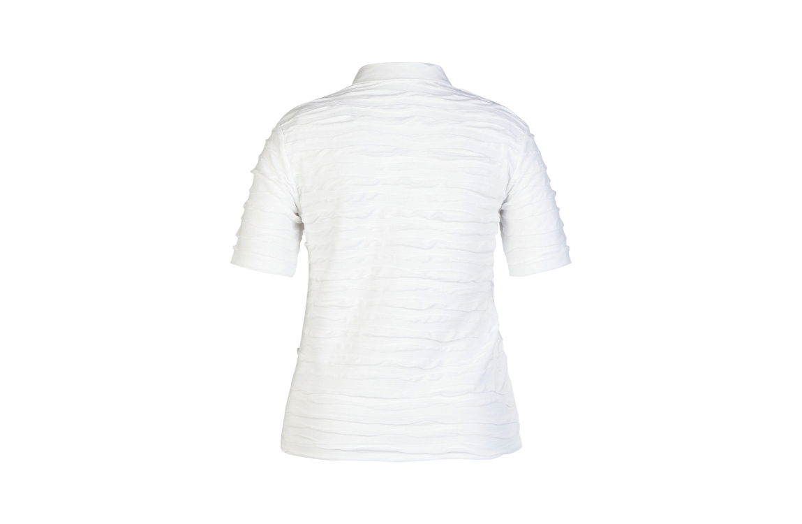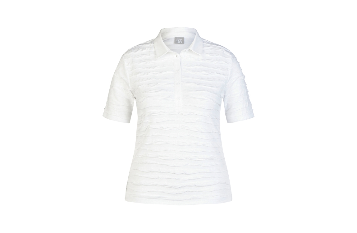 Rabe poloshirt 56-121303. Dit regular fit model heeft een kraag met knoopsluitingen en korte mouwen. Dit witte poloshirt van Rabe is all-over bewerkt met een golvende structuur en is uitgevoerd in stretchkwaliteit.