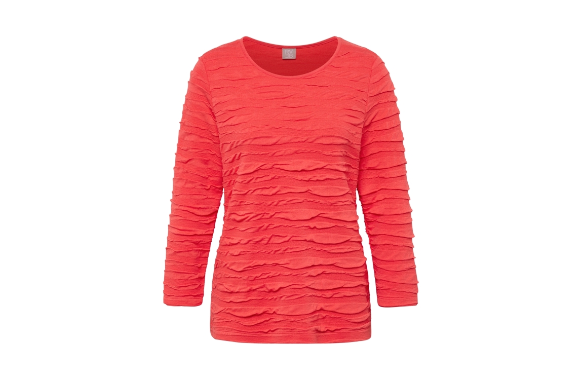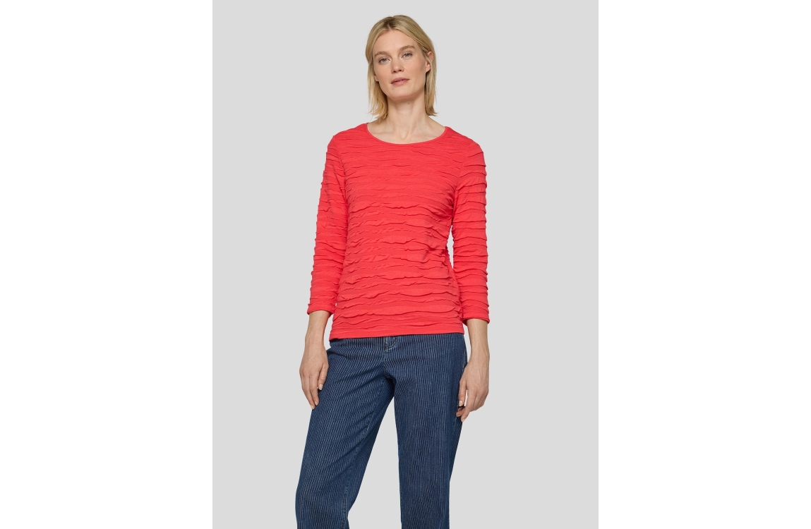 Rabe shirt 56-111300 6280. Dit rechtvallende model heeft een ronde halslijn en driekwart mouwen. Deze roodkleurige shirt van Rabe is all-over bewerkt met een golvende structuur en is uitgevoerd in lichte stretchkwaliteit.