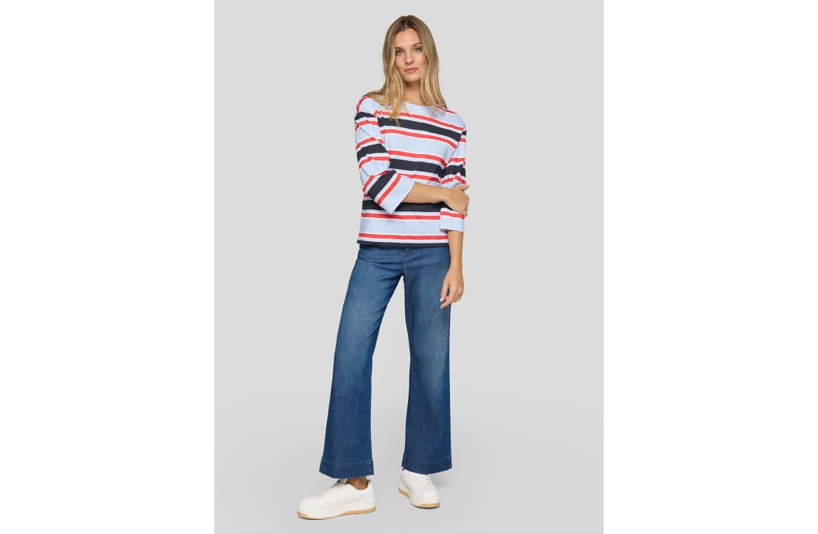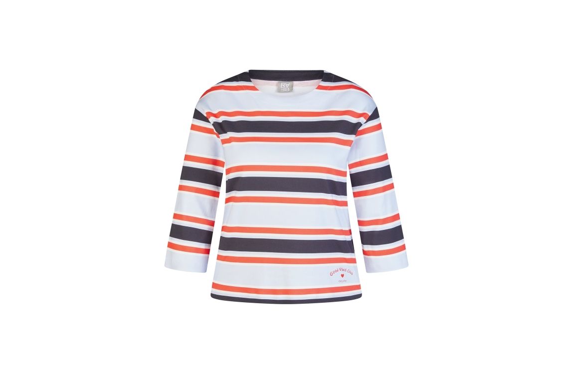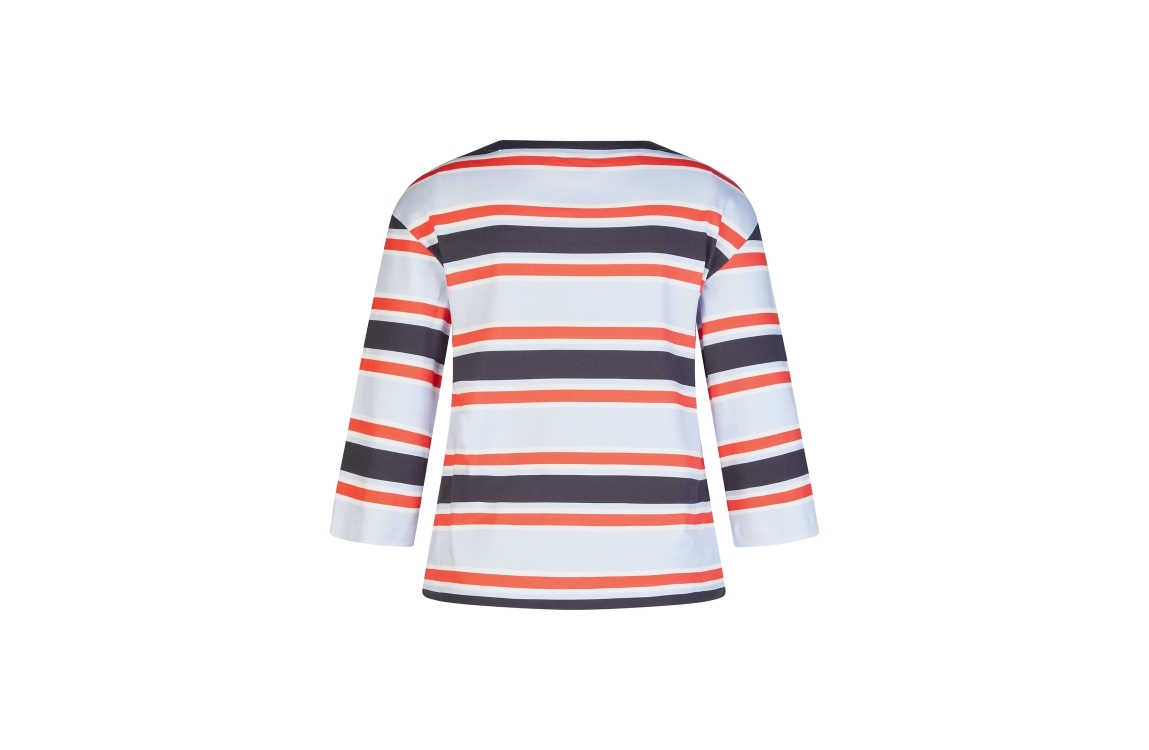 Rabe shirt 56-111379 6305. Dit rechtvallende model heeft een ronde, wijde halslijn en driekwart mouwen. Deze blauwe shirt van Rabe is all-over bewerkt met een streepprint in verschillende kleuren en is uitgevoerd in stretchkwaliteit.