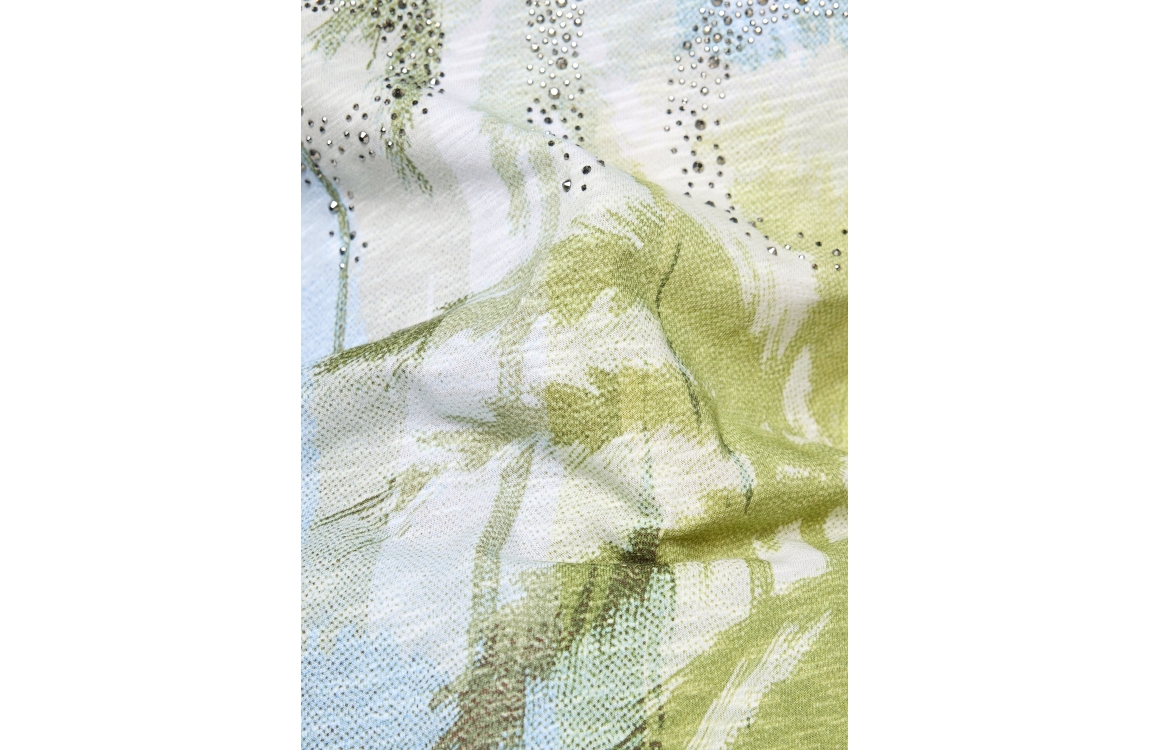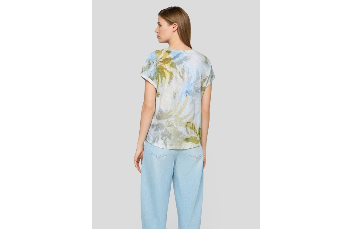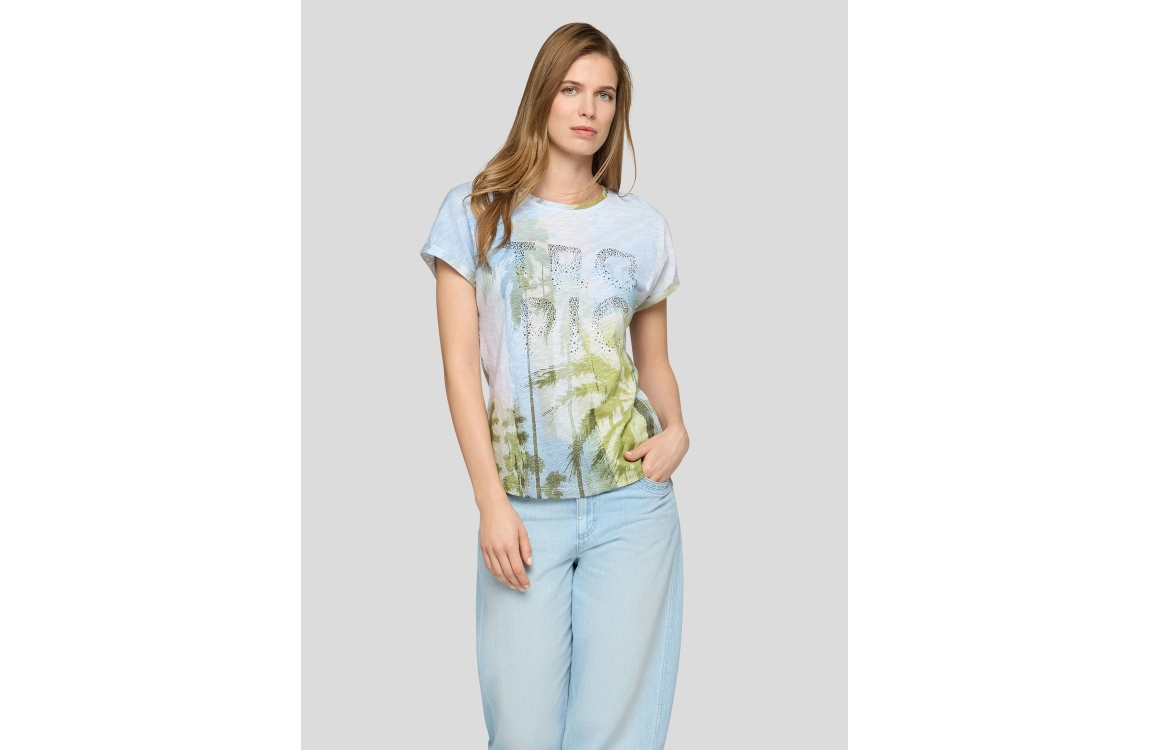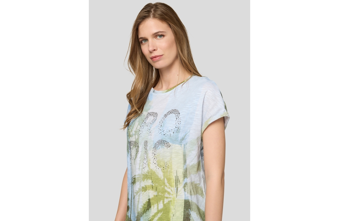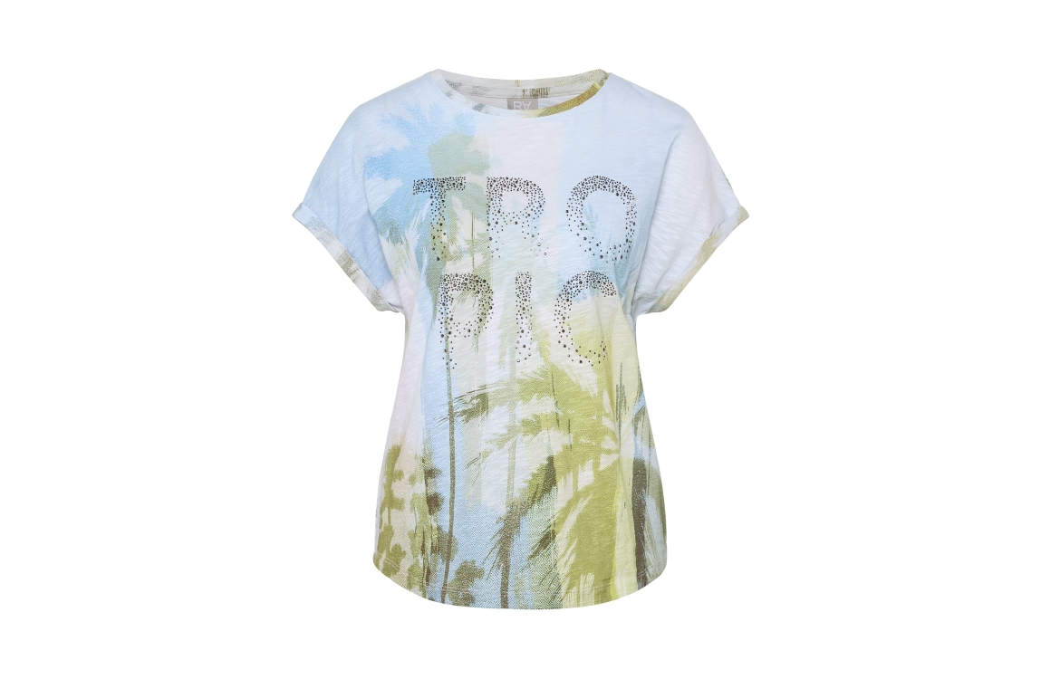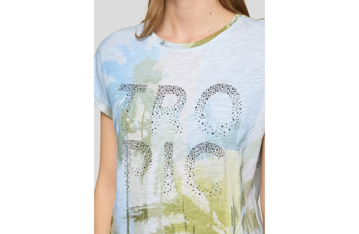 Rabe T-Shirt 56-122374. Dit soepelvallend model heeft een ronde hals en korte mouwen. Dit blauwe T-shirt van Rabe is bewerkt met een tropische print en voorzien van subtiele glitters.