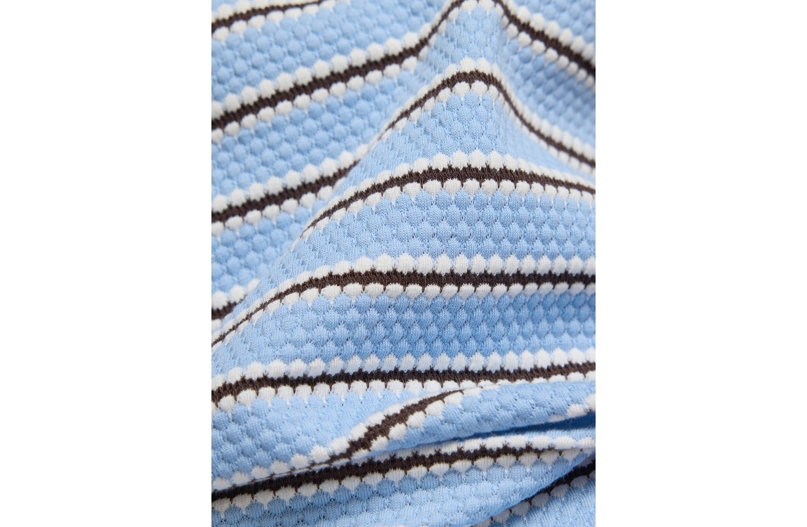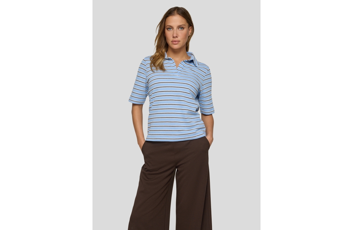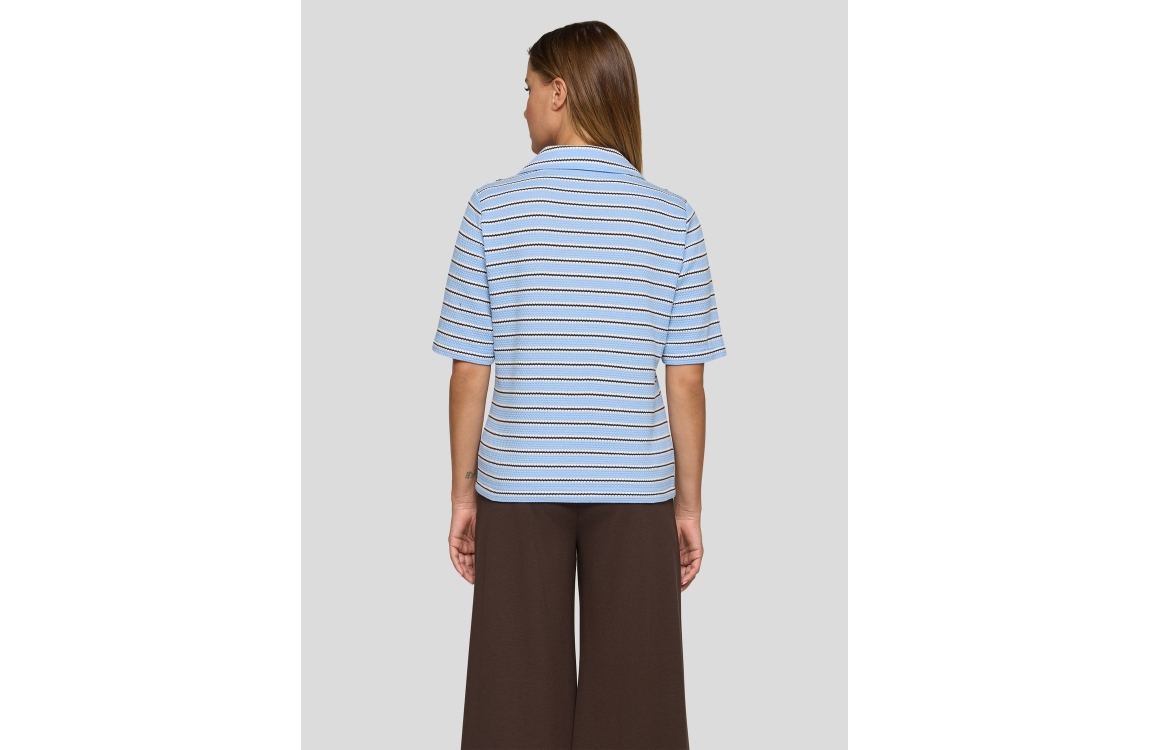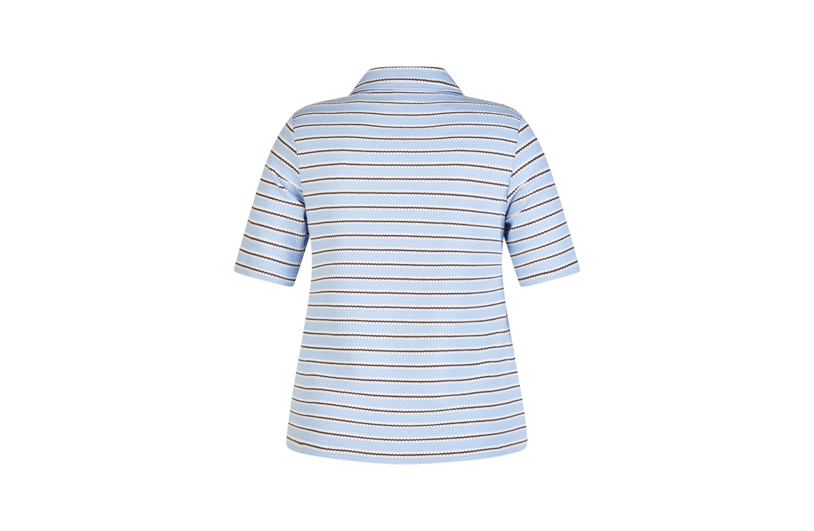 Rabe T-Shirt 6333 Ozean. Dit rechtvallende model is voorzien van een kraag en heeft korte mouwen. Dit blauwe T-shirt van Rabe is all-over bewerkt met een streeppatroon.