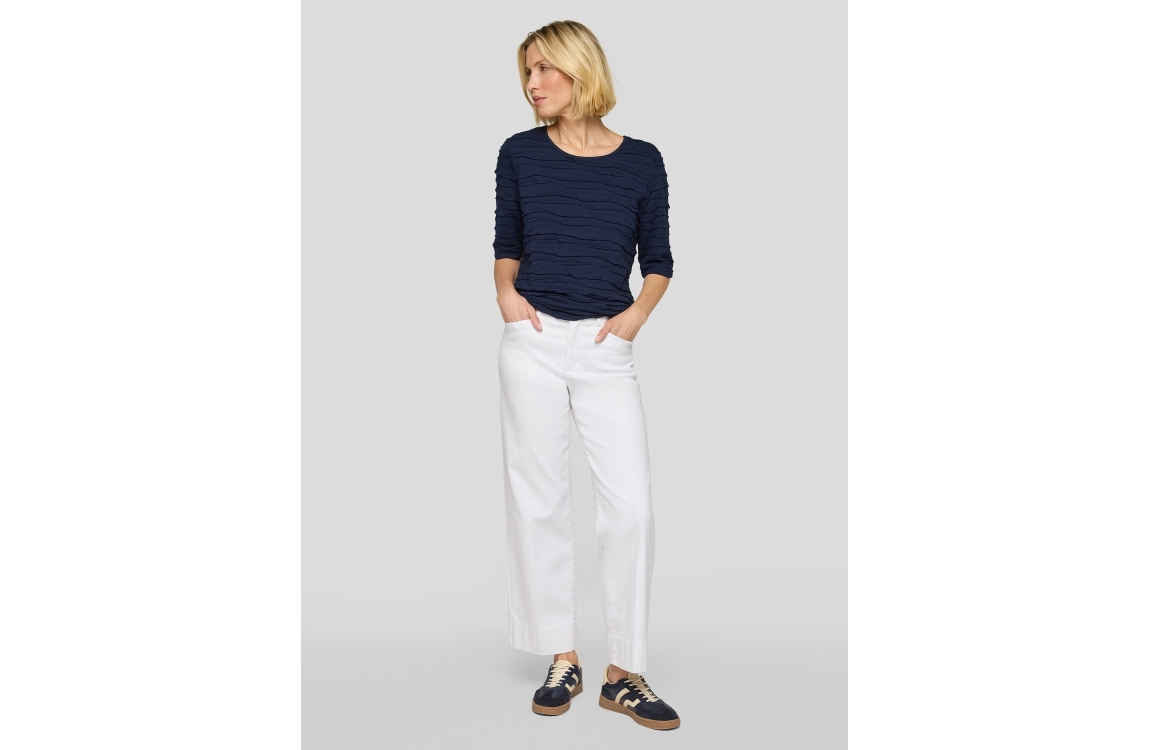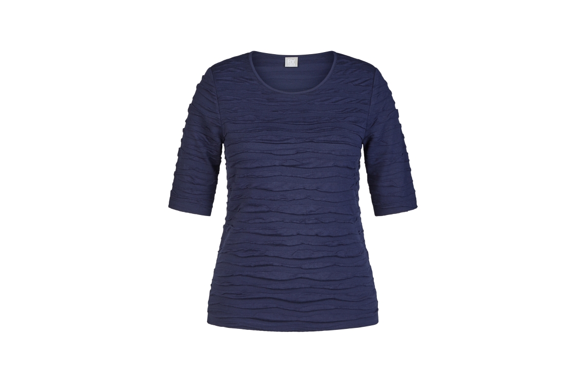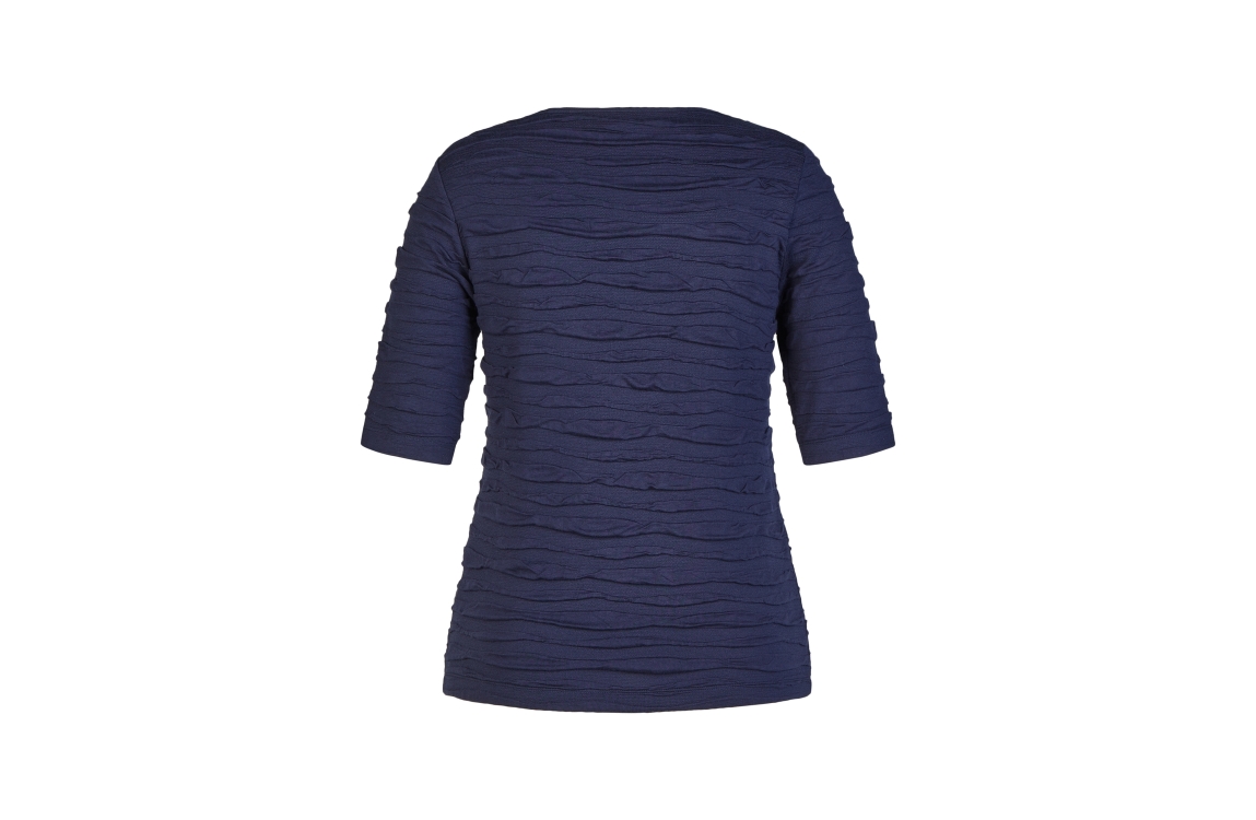 Rabe shirt 56-121302 6374. Het regular fit model heeft een ronde halslijn en halve mouwen. Dit donkerblauwe shirt van Rabe is all-over bewerkt met een golvende structuur en is uitgevoerd in stretchkwaliteit.