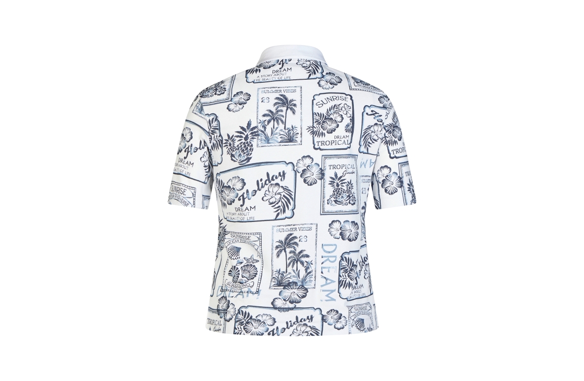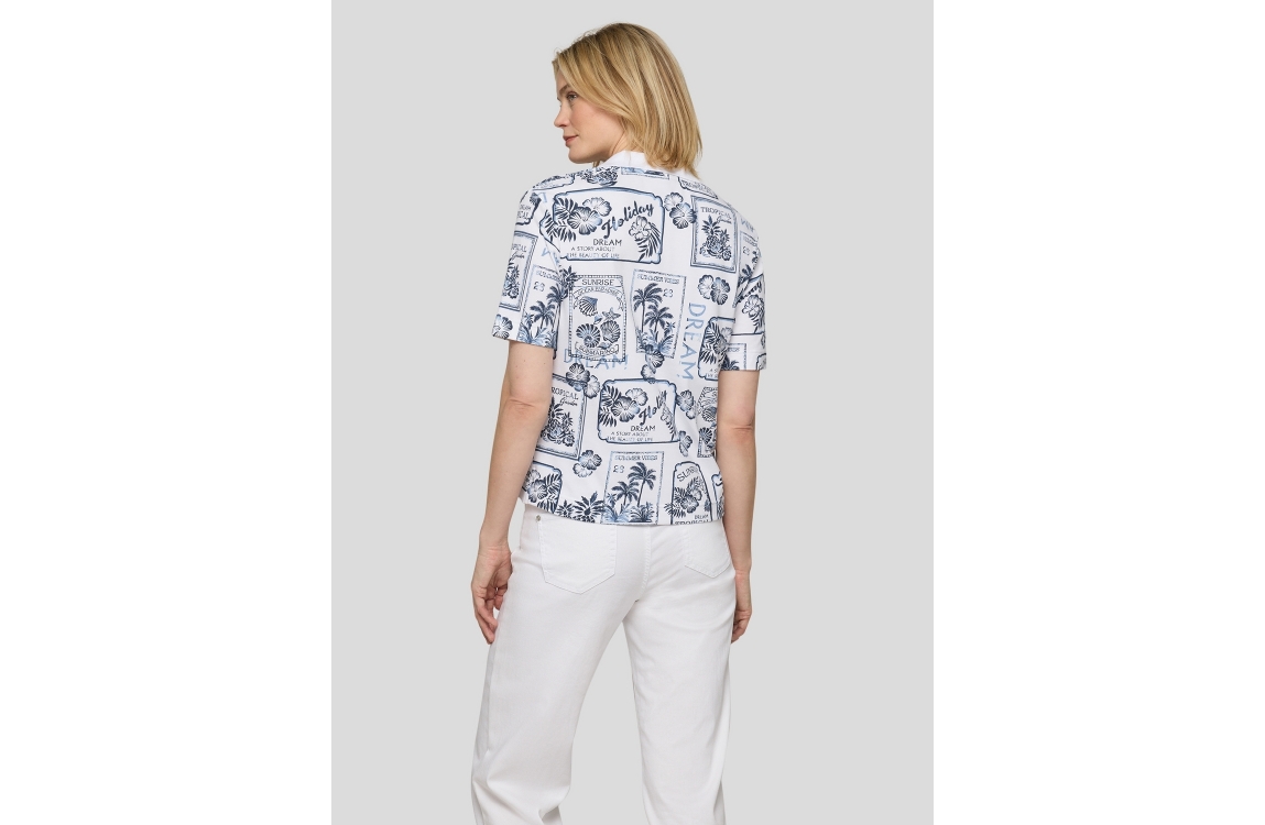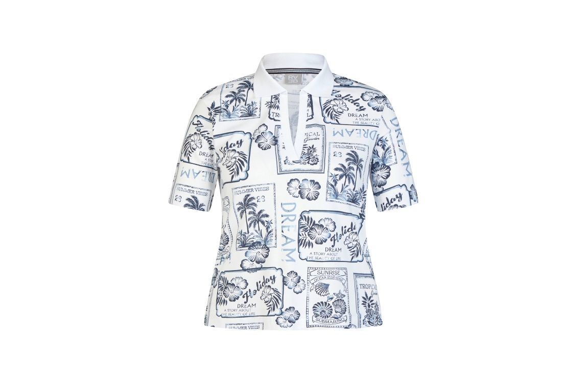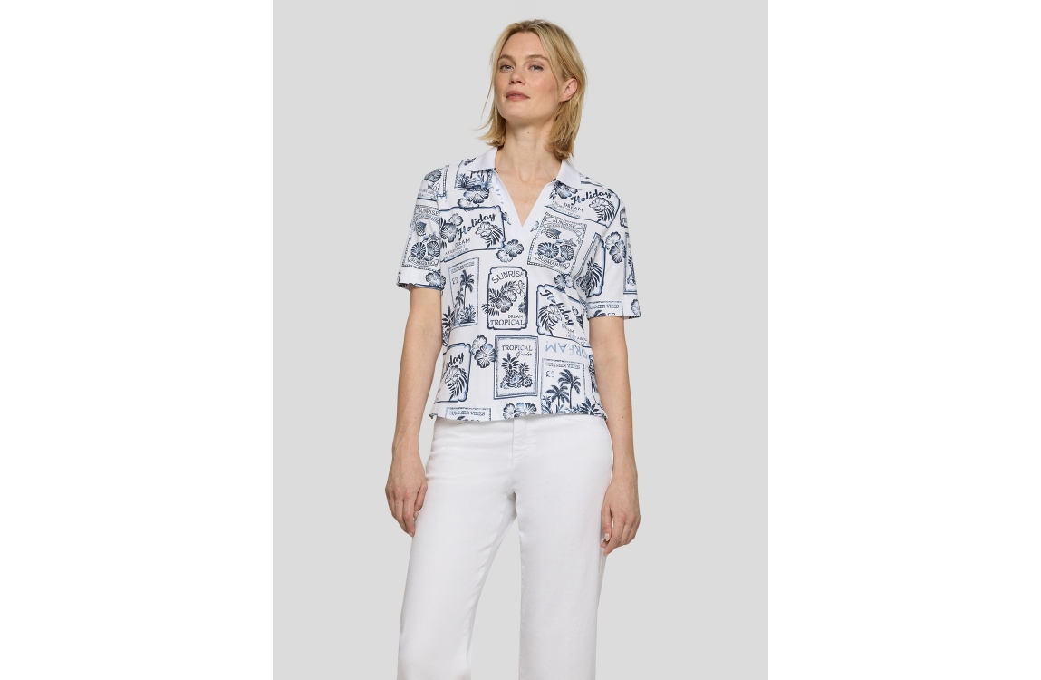 Rabe shirt 56-121371 6374. Dit rechtvallende model heeft een polokraag en korte mouwen. Dit witte shirt van Rabe is all-over bewerkt met verschillende prints in de kleur donkerblauw en is uitgevoerd in stretchkwaliteit.