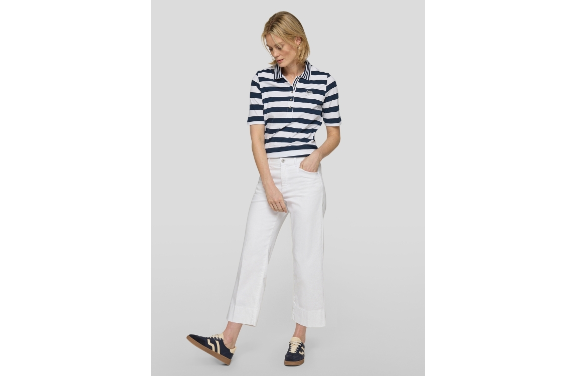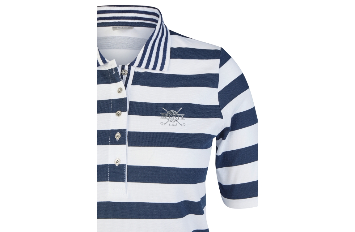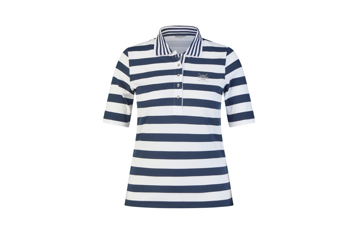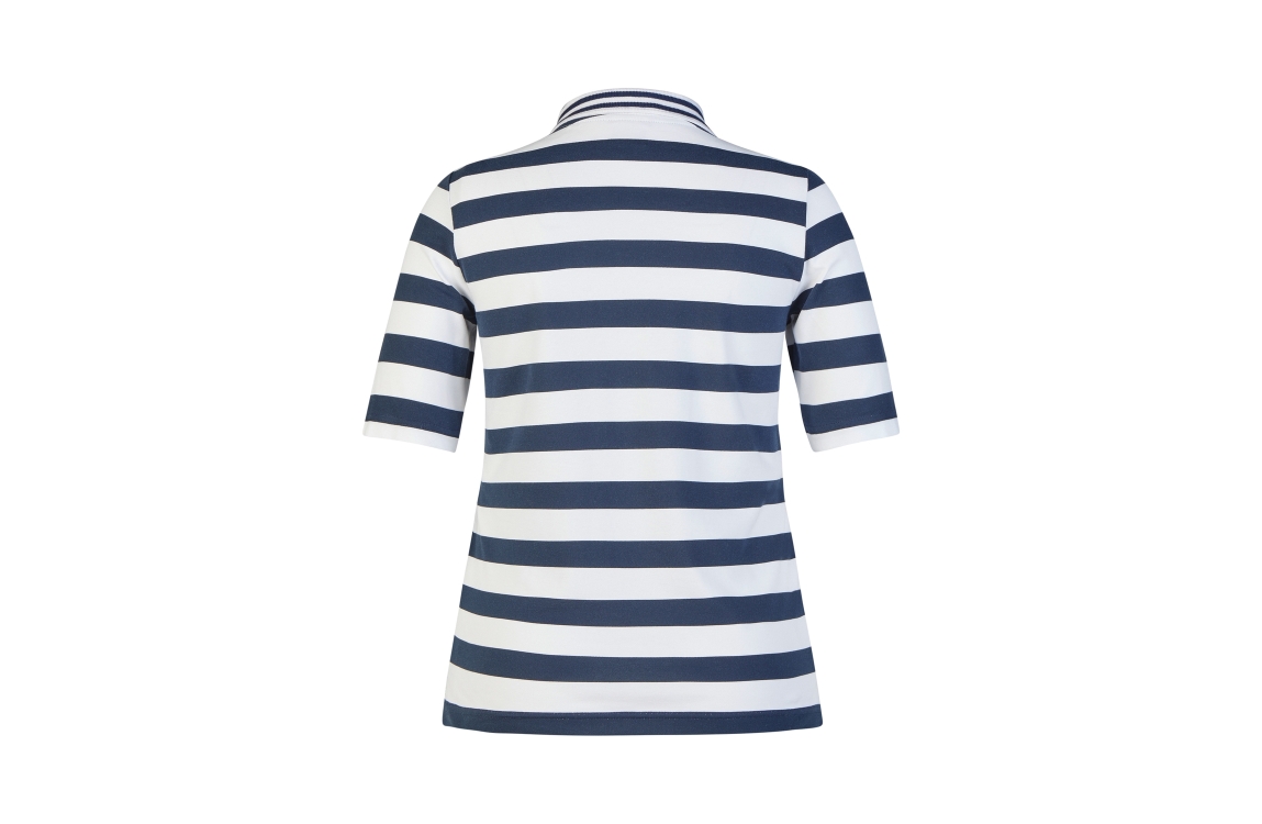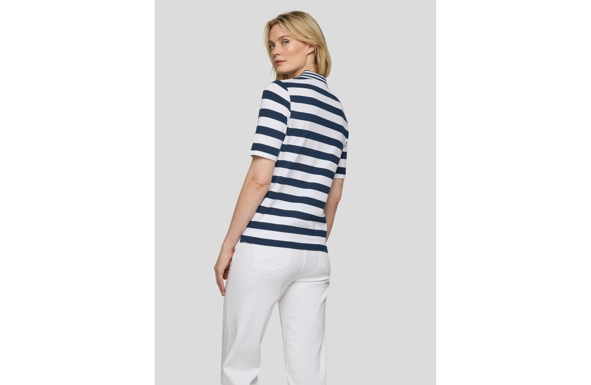 Rabe poloshirt 56-121380 6374. Het rechtvallende model heeft een kraag met knoopsluitingen en korte mouwen. Dit donkerblauwe poloshirt van Rabe is all-over bewerkt met een streepprint en is op de linkerborst gedetailleerd met strass-steentjes.