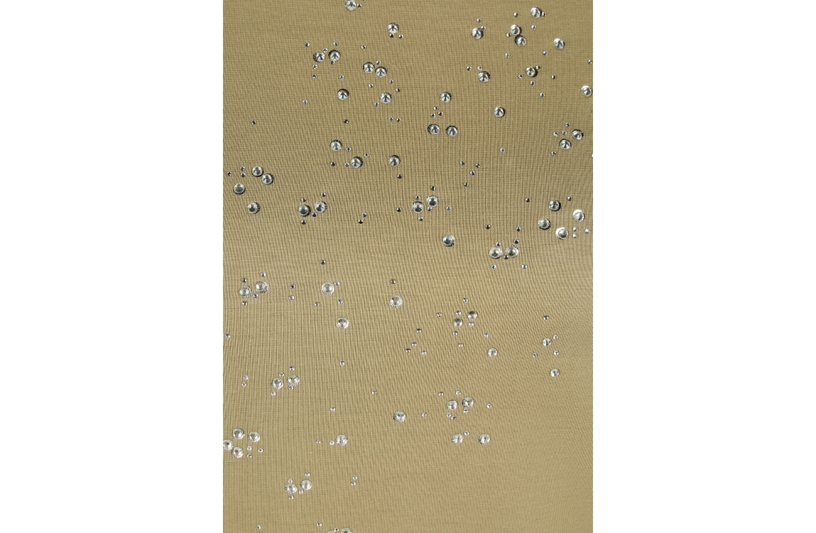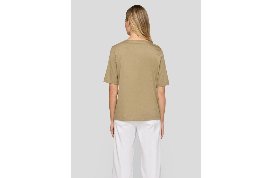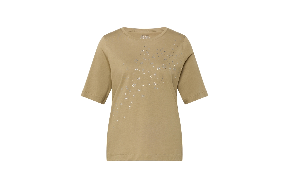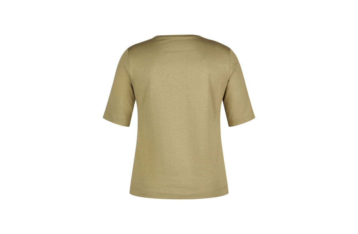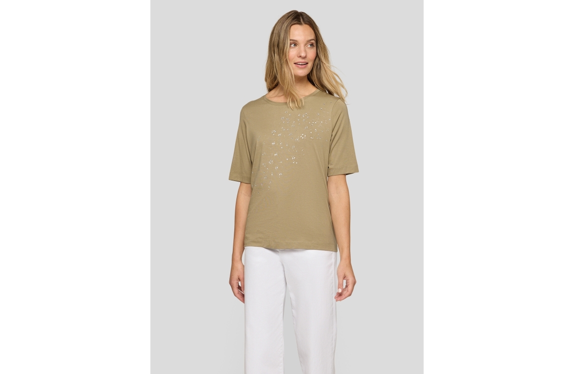 Rabe T-shirt 56-122312 6462. Dit rechtvallende model heeft een ronde halslijn en korte mouwen. Dit donkergroene T-shirt van Rabe is op het voorpand gedetailleerd met strass-steentjes en is uitgevoerd met een comfortabele pasvorm.