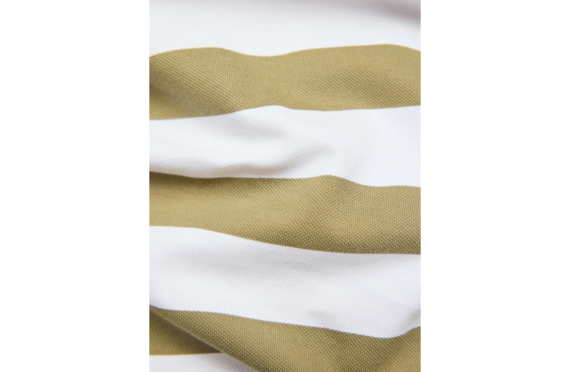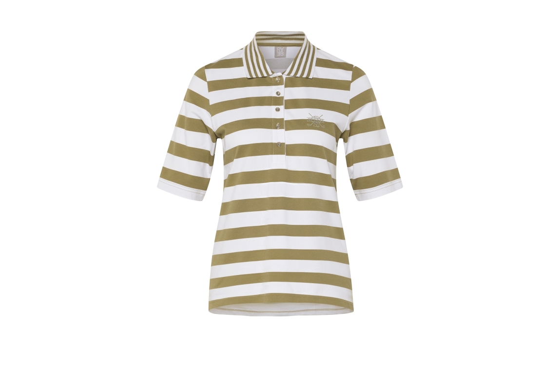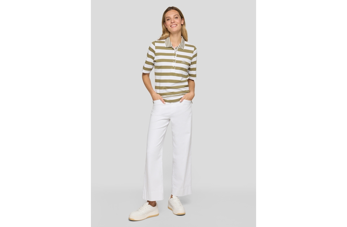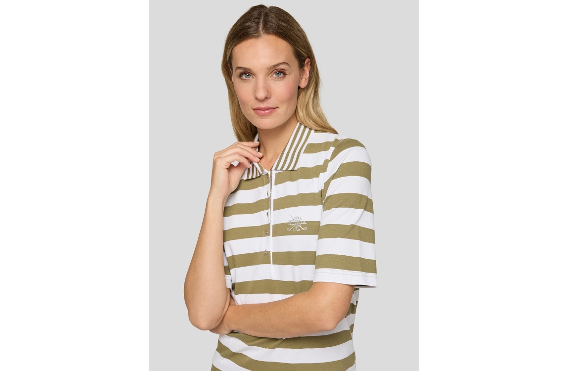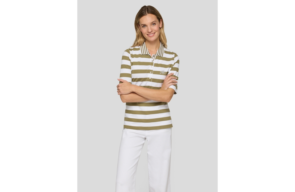Rabe poloshirt 56-122380. Dit rechtvallend model heeft een polokraag met knopen en korte mouwen. Dit wit/groen gestreepte poloshirt van Rabe is bewerkt met een glitter logo aan de voorzijde.