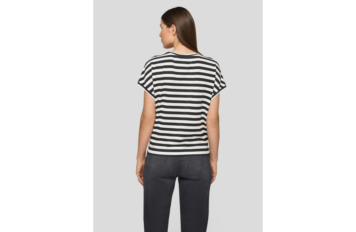 Rabe T-shirt 56-115352. Dit rechtvallend model is voorzien van een ronde hals en heeft korte mouwen. Deze crèmekleurige T-shirt van Rabe is aan de voorzijde bewerkt met een bloemenprint afgewerkt met strass steentjes en aan de achterzijde bewerkt met een streepprint.