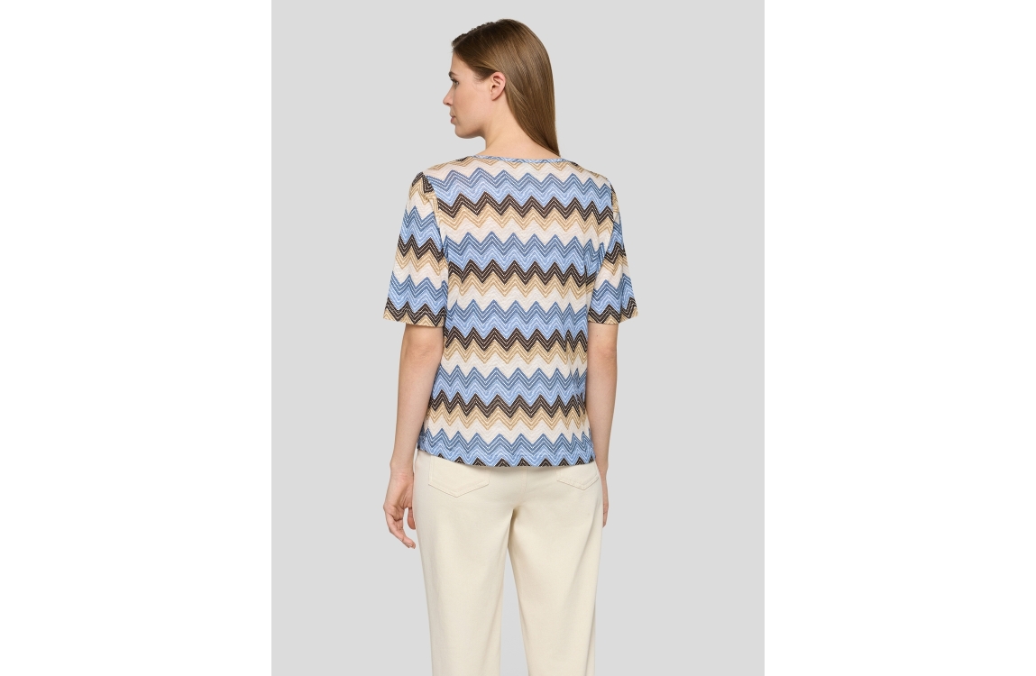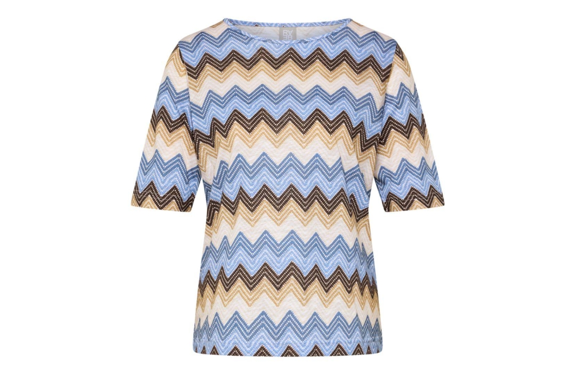Rabe T-Shirt 6642 Cappuccino. Dit rechtvallende model is voorzien van een ronde hals en korte mouwen. Dit beige T-shirt van Rabe is all-over bewerkt met een patroon.