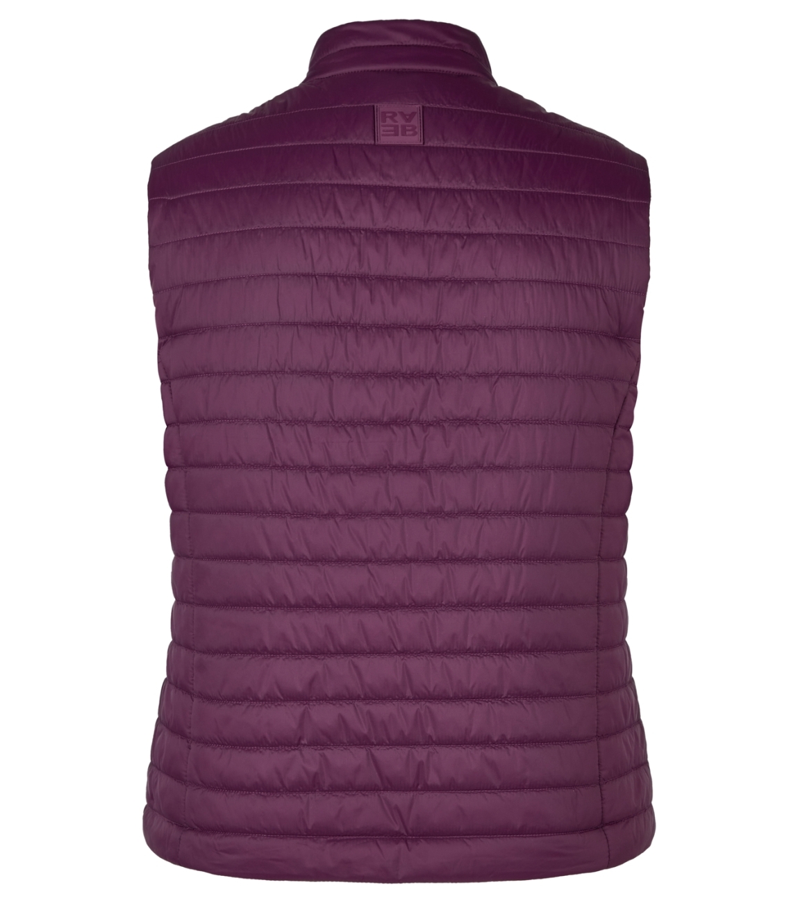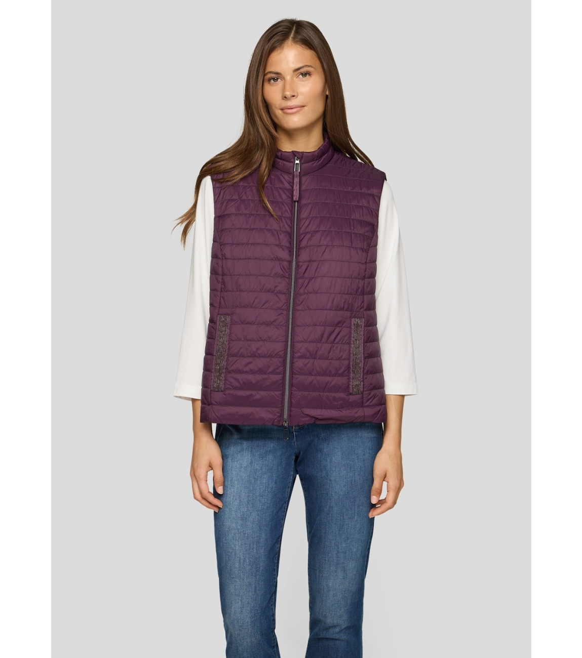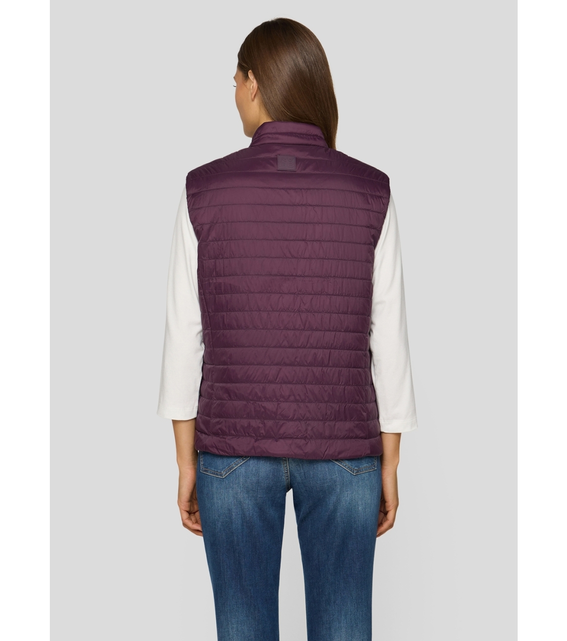 Rabe Weste 5287 Pflaume. Dit rechtvallende model heeft een opstaande kraag met trekkoord en is mouwloos. Deze paarse bodywarmer van Rabe sluit aan de voorzijde door middel van een rits en beschikt over twee steekzakken.