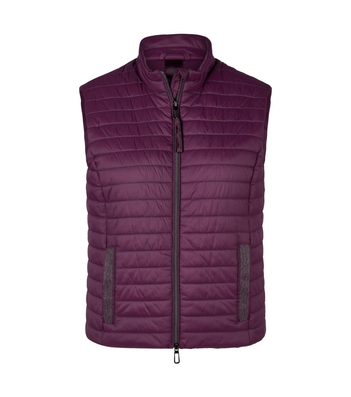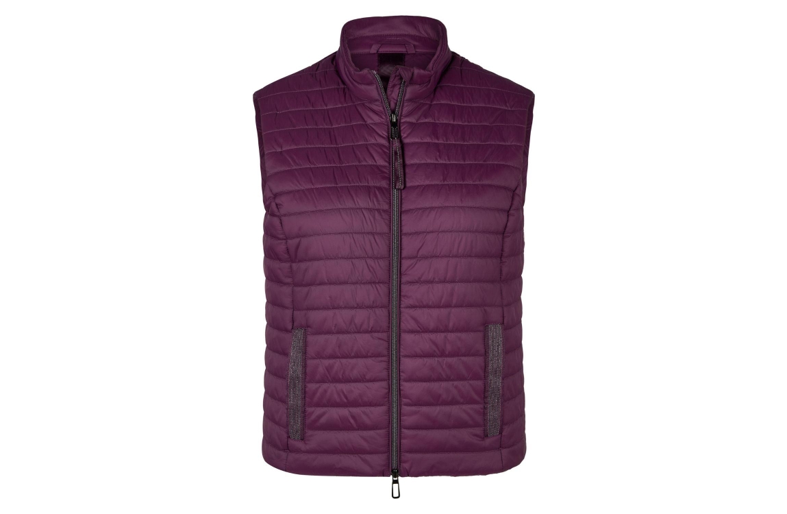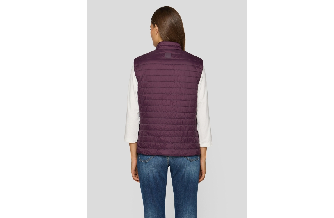 Rabe Weste 5287 Pflaume. Dit rechtvallende model heeft een opstaande kraag met trekkoord en is mouwloos. Deze paarse bodywarmer van Rabe sluit aan de voorzijde door middel van een rits en beschikt over twee steekzakken.