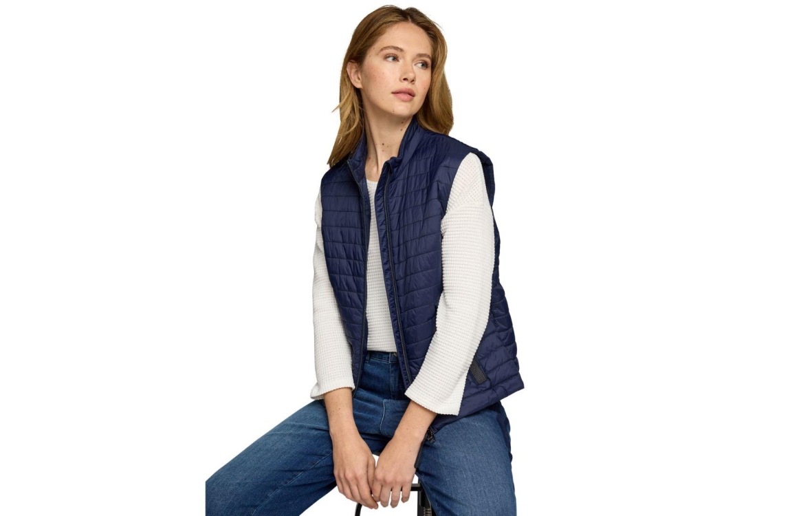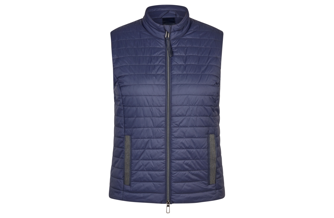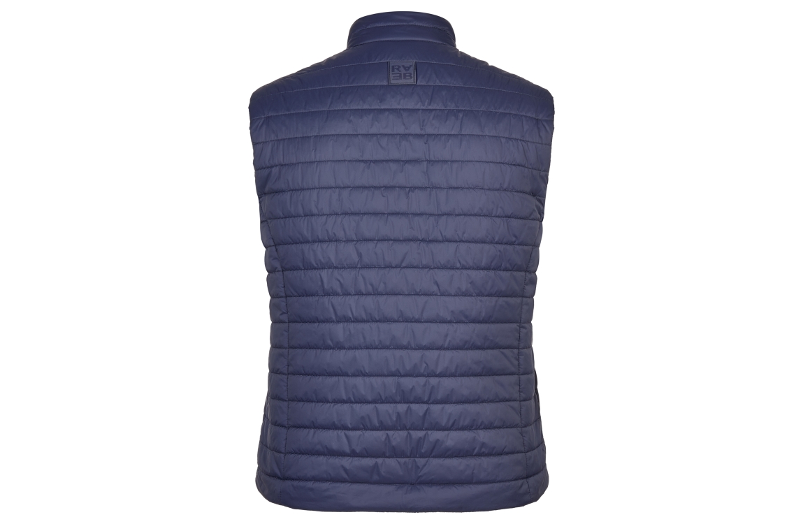 Rabe bodywarmer 55-214870. Dit rechtvallende model heeft een opstaande kraag en is mouwloos. Deze donkerblauwe bodywarmer van Rabe sluit aan de voorzijde door middel van een rits en is voorzien van twee gedetailleerde steekzakken.
