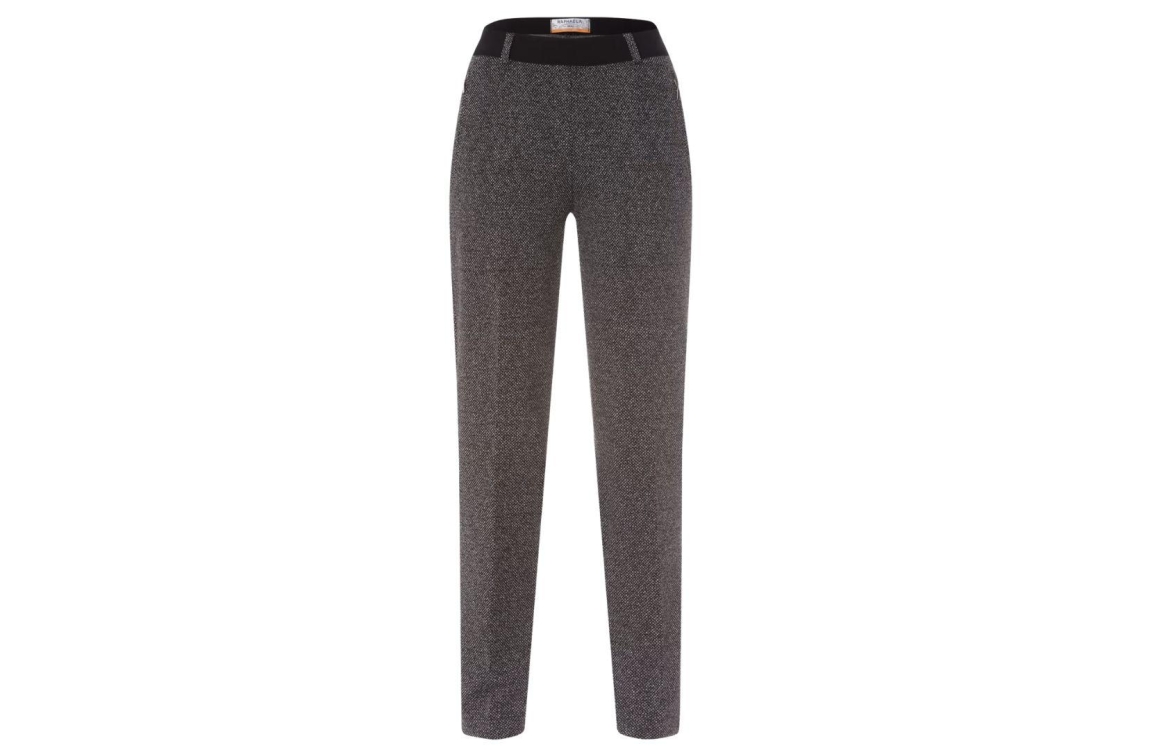 Raphaela by Brax LILLYTH 17-5308/08. Dit regular fit model sluit door middel van een elastische boord en heeft ceintuurlussen. Deze donkergrijze brax broek is bewerkt met een grafisch patroon. Dit model is voorzien van twee ritszakken aan de voorzijde.