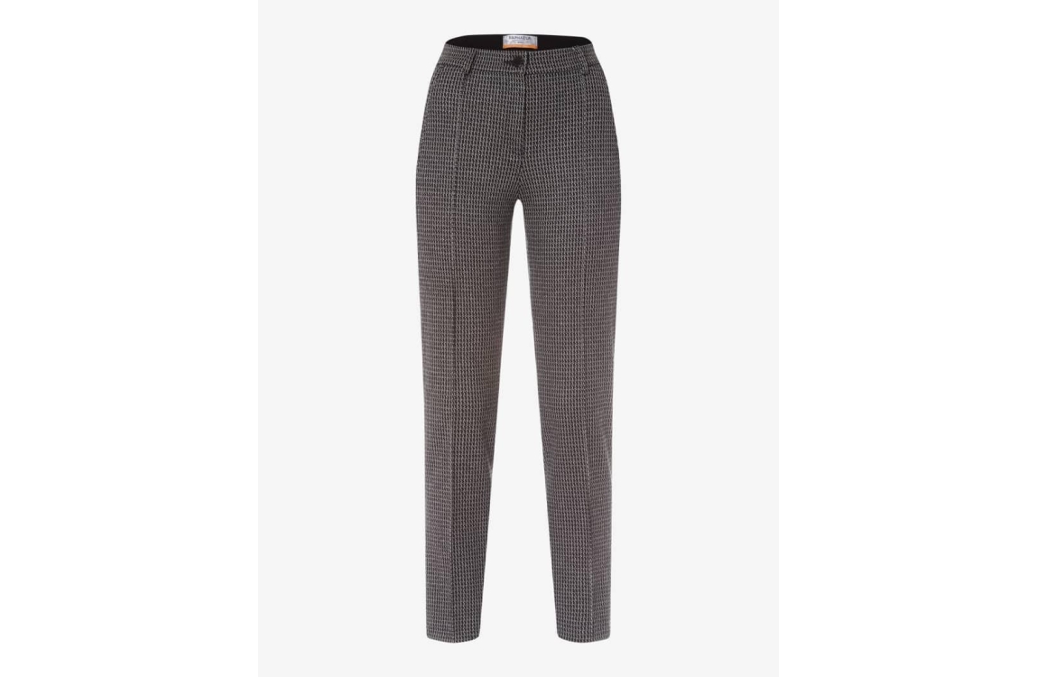 Raphaela by Brax  broek LILLYTH NEW 17-5668/08. Dit regular fit model sluit door middel van een rits,knoop en elastische boord. Deze zwarte Raphaela by Brax broek is bewerkt met wit pied de poule patroon. Dit model is voorzien van twee ritszakken aan de voorzijde en dit model is gedetailleerd met een naaddetail over de lengtes aan de voorzijde.