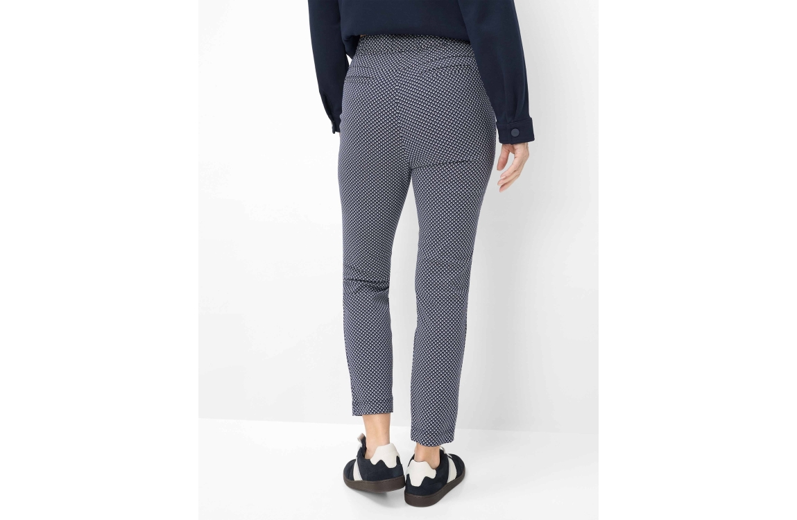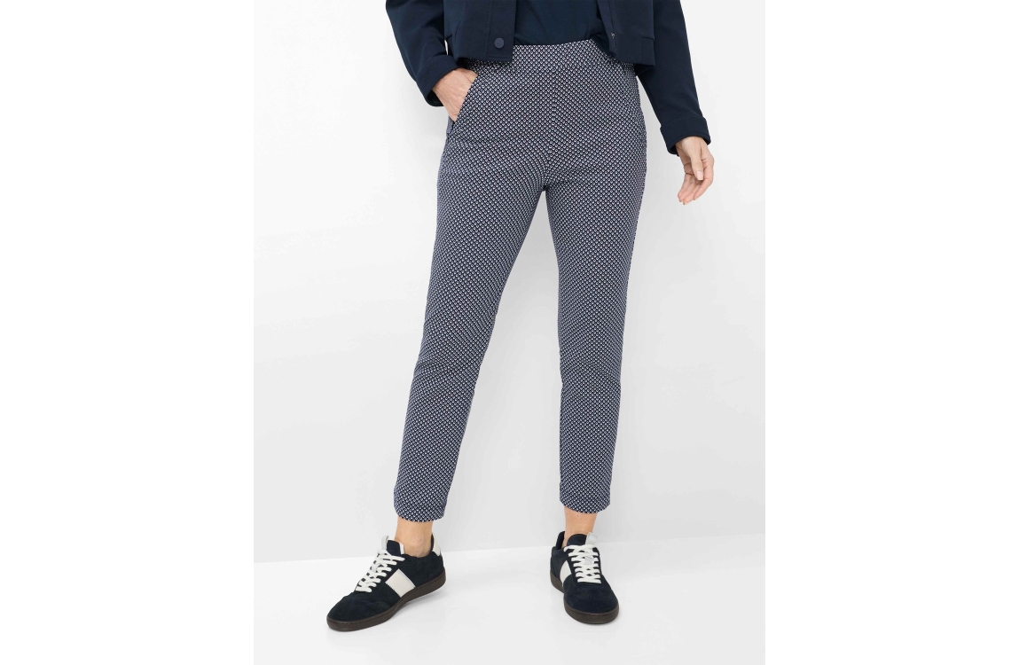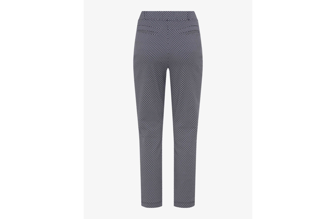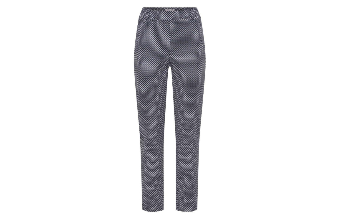 Raphaela by brax LILLYTH 10-4750/22. Dit regular fit model sluit door middel van een elastische boord en heeft ceintuurlussen. Deze donker blauwe Raphaela by Brax broek is bewerkt met een grafisch patroon. Dit model beschikt over twee ritszakken aan de voorzijde en twee paspelzakken aan de achterzijde.
