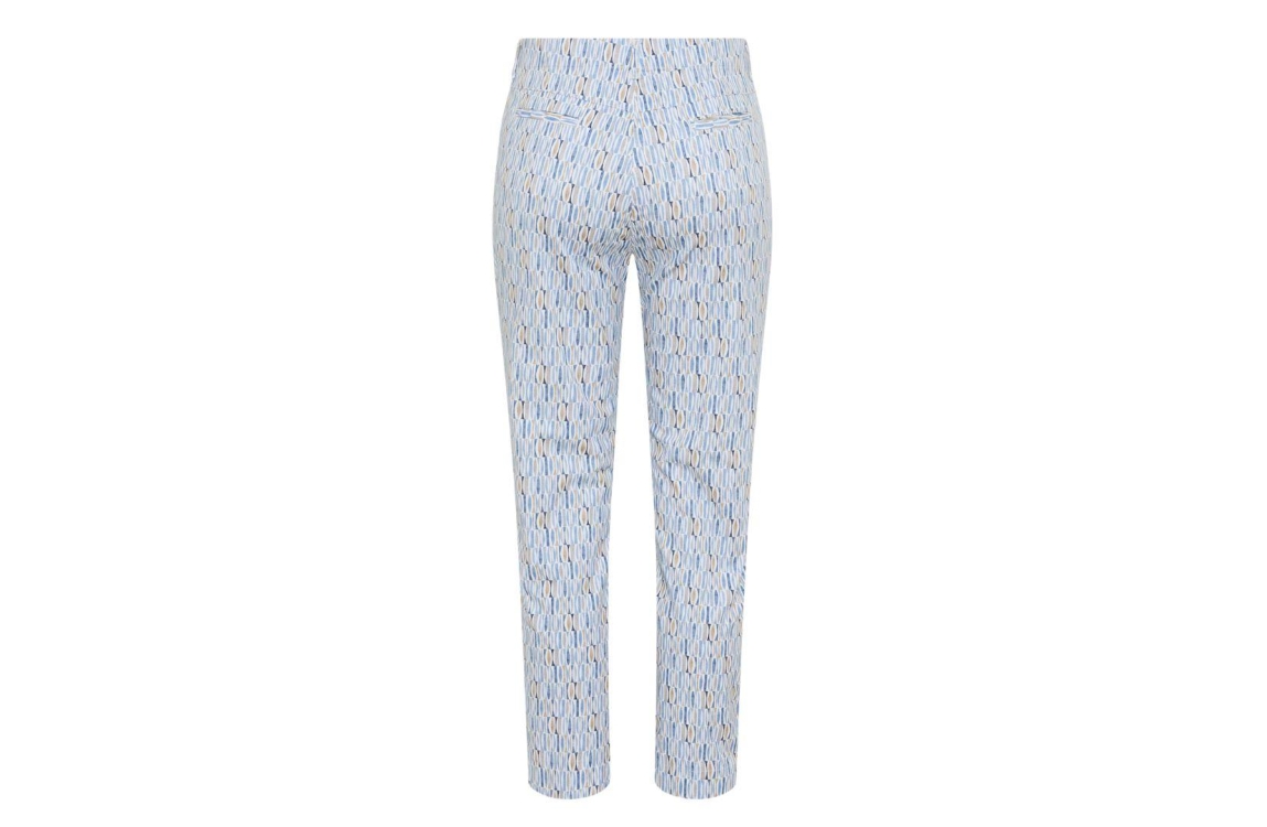 Raphaela by Brax broek 10-3570 10878520 25. Dit regular fit model sluit door middel van een knoop- en ritssluiting en is voorzien van ceintuurlussen. Deze blauwe broek van Raphaela by Brax is all-over bewerkt met een grafische print in verschillende kleuren en is voorzien van twee steekzakken aan de voorzijde en twee paspelzakken aan de achterzijde.