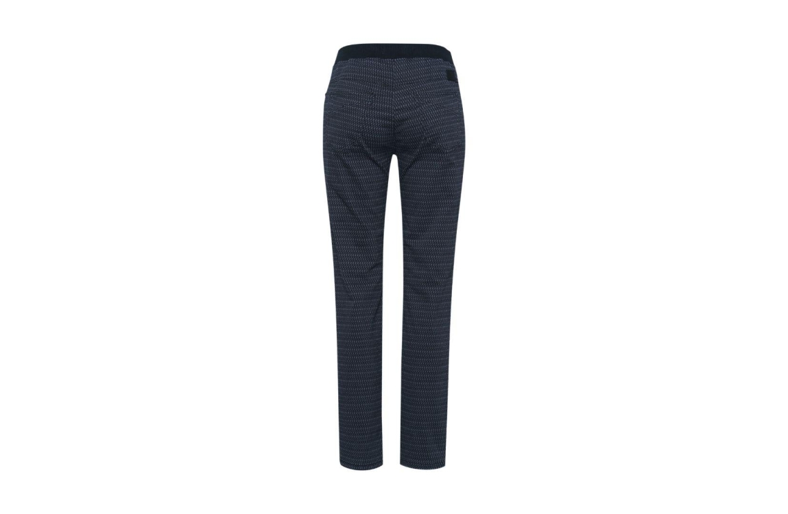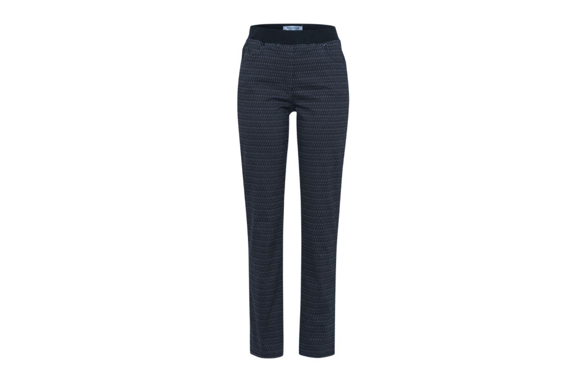 Raphaela by Brax broem Pamina 13-1258/22. Dit slim fit model sluit door middel van een elastische ribboord en is voorzien van twee steekzakken met muntzak aan de voorzijde en twee steekzakken aan de achterzijde. Deze donkerblauwe broek van Raphaela by Brax is all-over bewerkt met een patroon.
