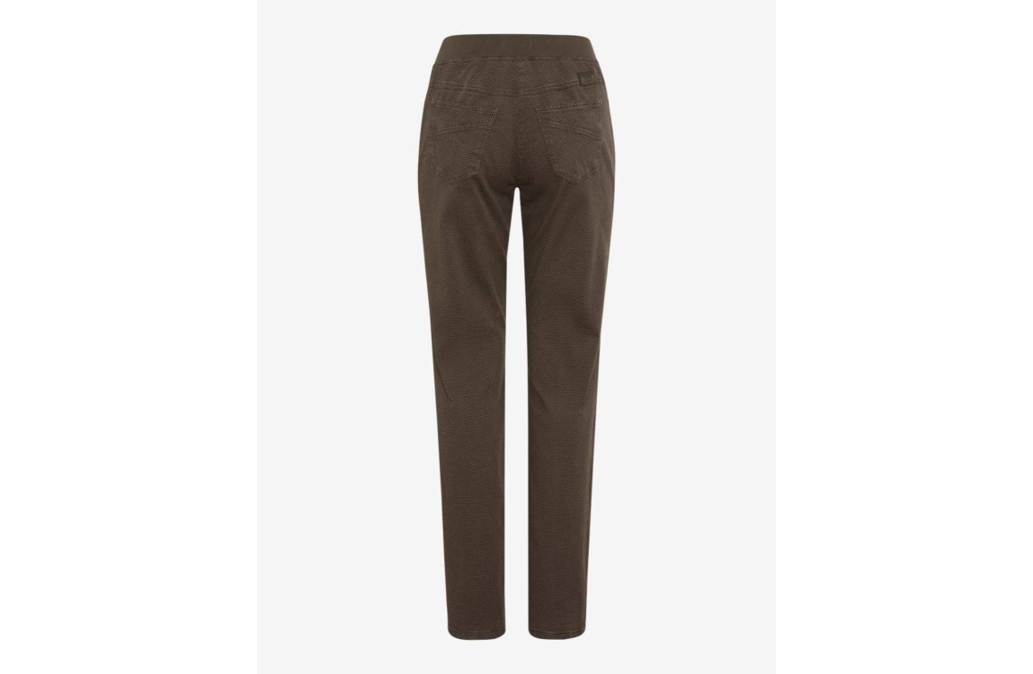 Raphaela by Brax PAMINA broek 17-1268 10849420. Het rechtvallend model sluit door middel van een elastische boord. Deze donkerbuine broek van Raphaela by Brax is voorzien van een subtiel patroon en bewerkt met verschillende zakken.