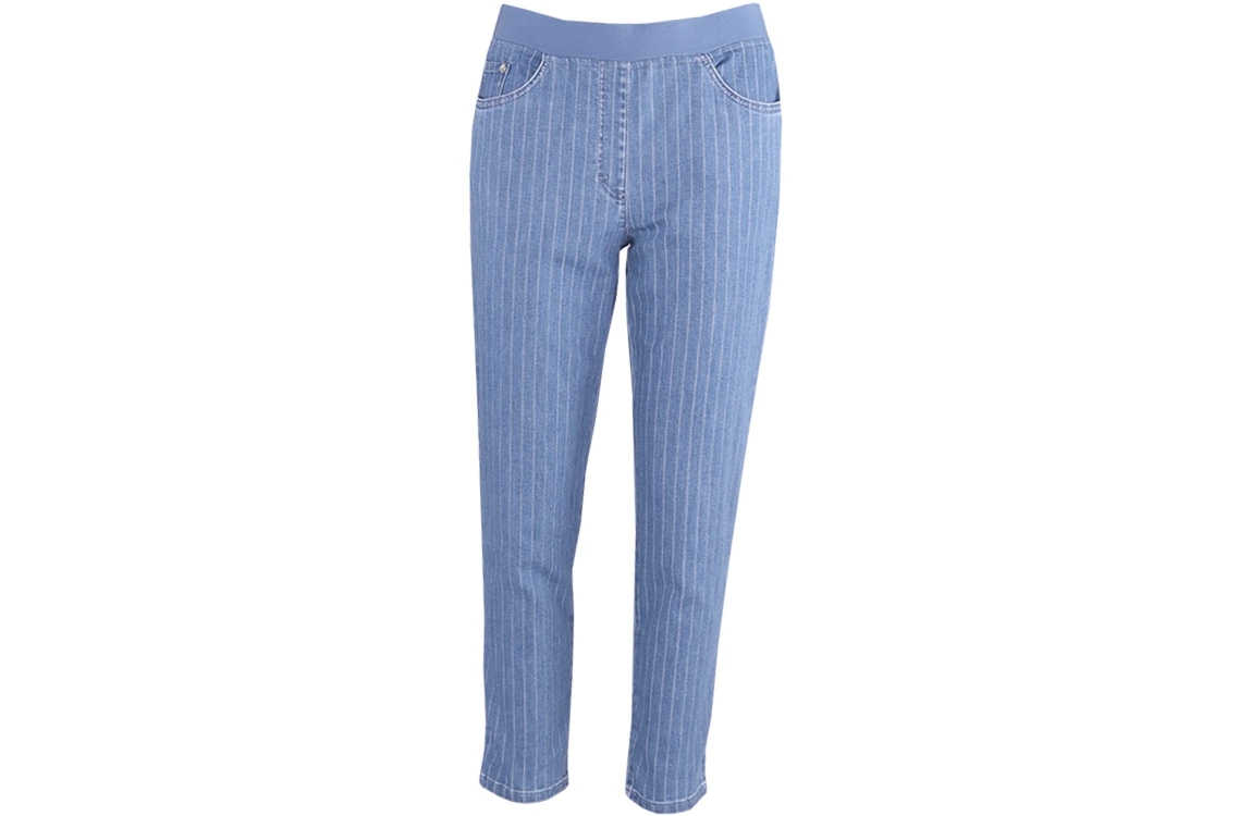 Raphaela by Brax broek 10-6410 10978620. Dit slim fit model sluit door middel van een donkerblauwe elastische boord. Deze denim broek van Raphaela by Brax is uitgevoerd in een 5-pocket model en is all-over bewerkt met een streepprint. Het model is voorzien van lichte stretchkwaliteit.