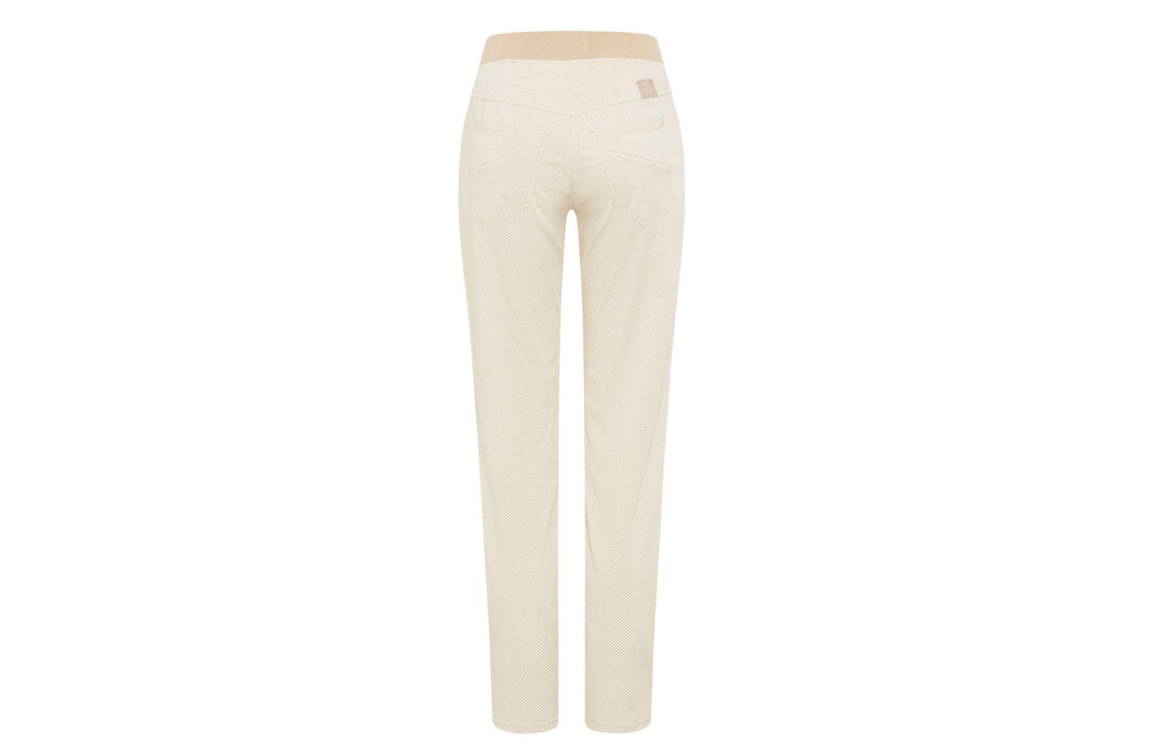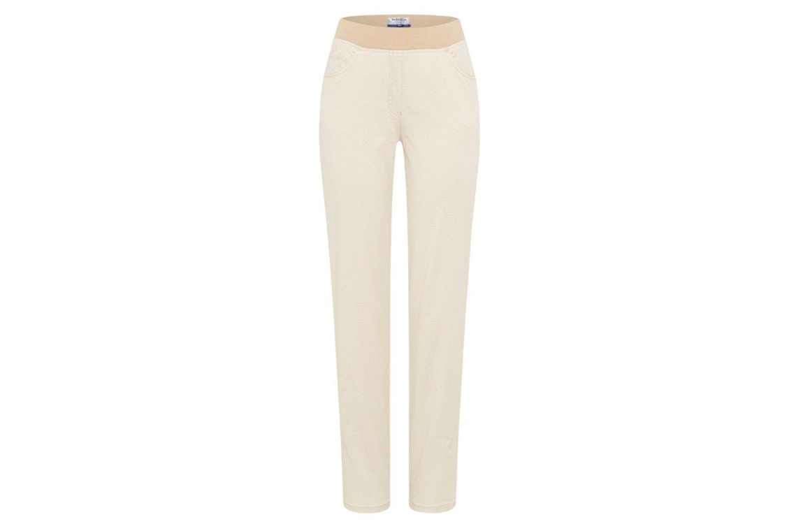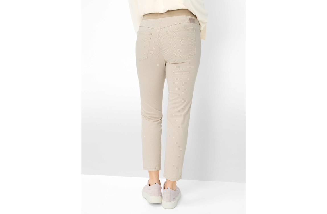 Raphaela by Brax broek 10-3520 10878620 56. Dit regular fit model sluit door middel van een elastische boord. Deze zandkleurige broek van Raphaela by Brax is all-over bewerkt met een grafische print en is uitgevoerd in een 5-pocket model.