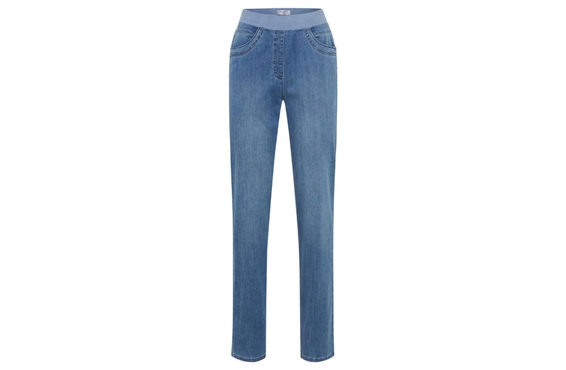 Raphaela by Brax PAMINA FUN broek 11-6308 10918620. Dit rechtvallend model sluit door middel van een elastische boord. Deze blauwe denim broek van Raphaela by Brax is voorzien van 5-pocket broekzakken en uitgevoerd in een stretch materiaal.