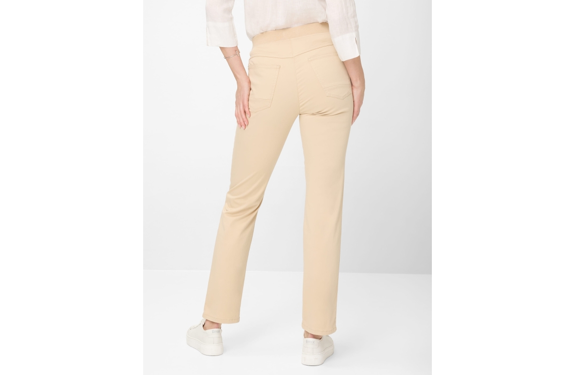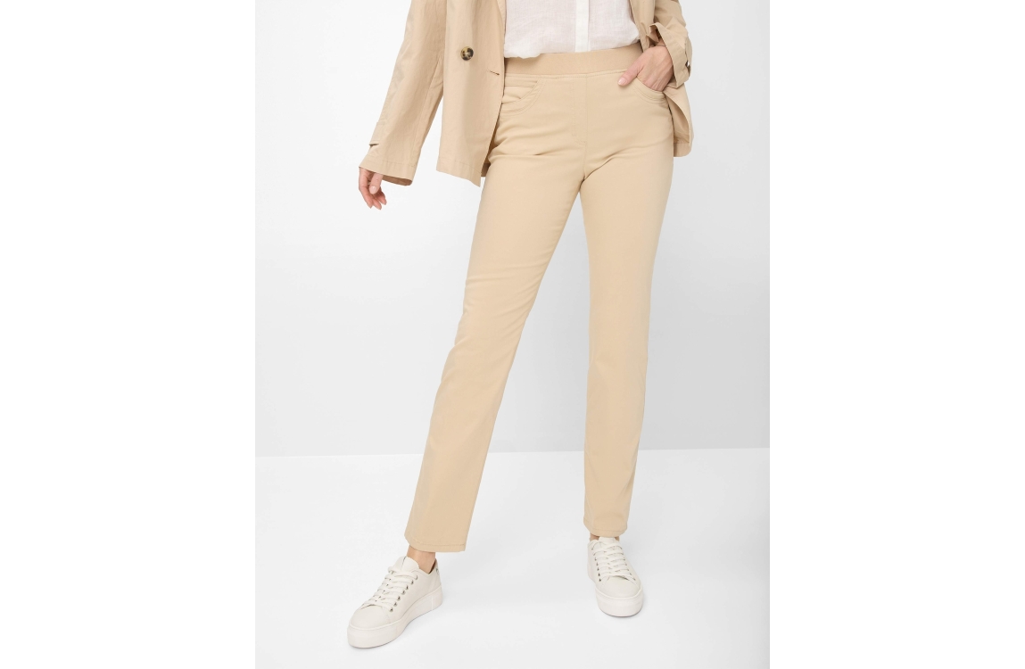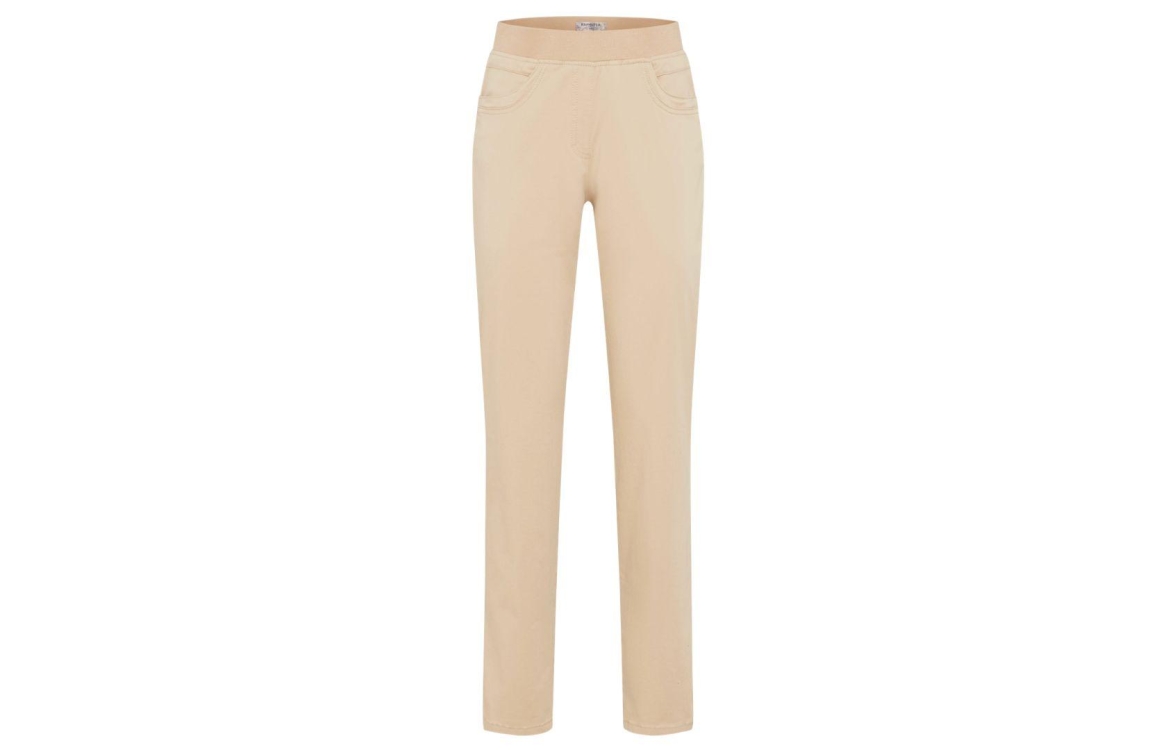 Raphaela by Brax broek 11-1558 10918620 Pamina. Dit regular fit model sluit door middel van een elastische band. Deze beige broek van Brax is voorzien van twee steekzakken op het voor- en achterpand.