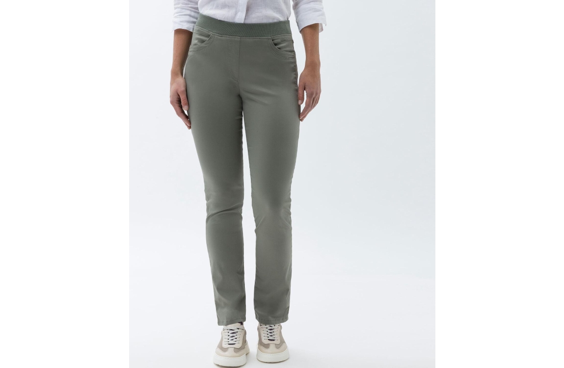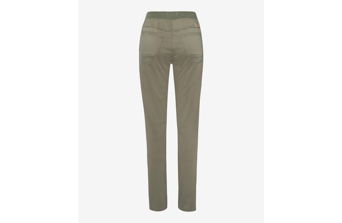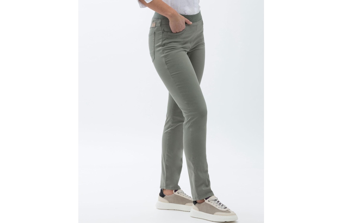 Raphaela by Brax broek 11-1558 10918620 Pamina. Dit aangesloten model sluit door middel van een elastische band. Deze legergroene broek van Brax is voorzien van twee steekzakken op het voor- en achterpand.