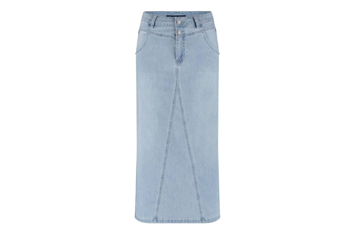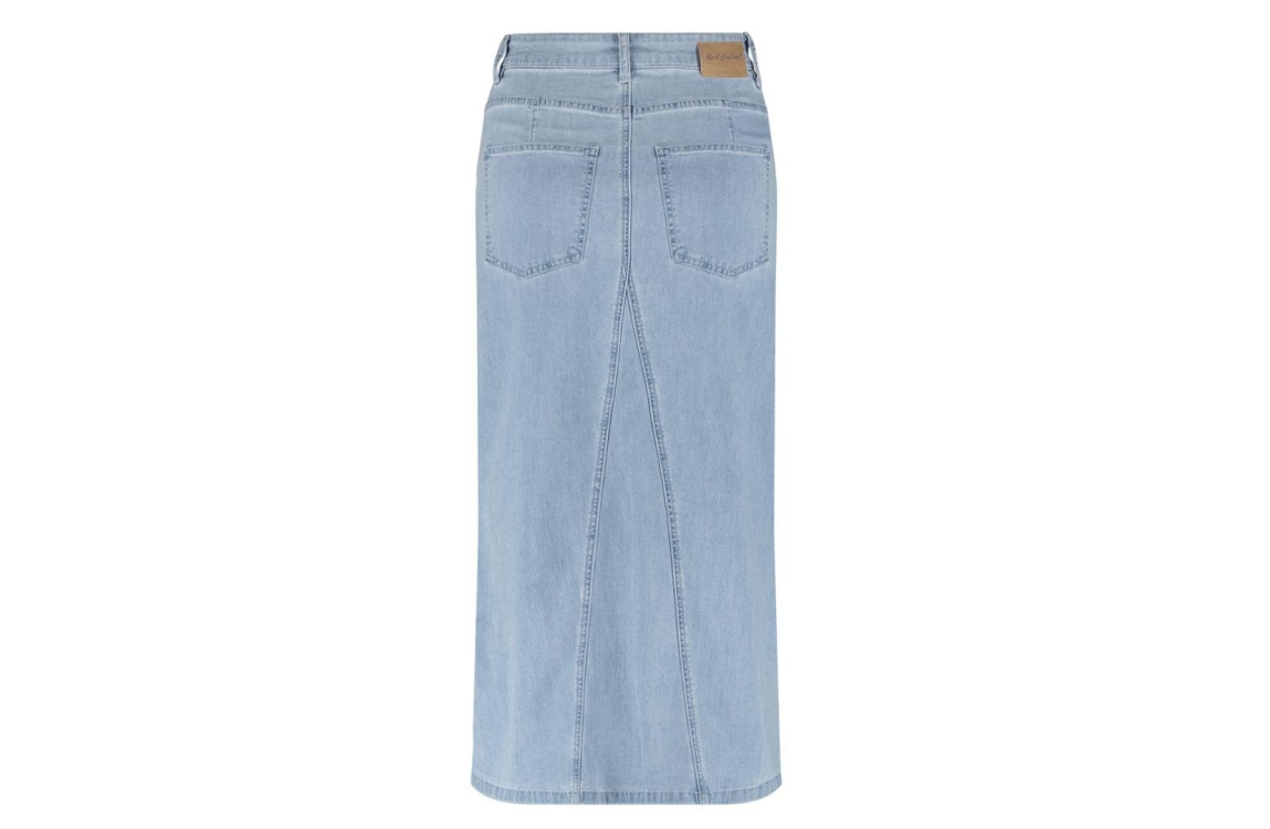 Red Button Alina rok SRB4431. Dit midi model sluit door middel van een knoop en rits afgewerkt met ceintuurlussen. Deze gebleekte blauwe rok beschikt over steekzakken.