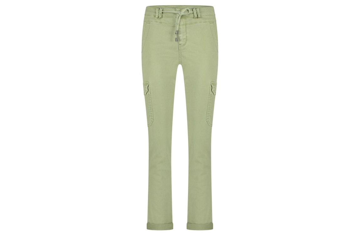 Red Button broek SRB4414. Dit soepelvallend model sluit door middel van een knoop en rits en een strikkoord. Deze groene broek van Red Button beschikt over steekzakken aan de voor- en achterzijde en over twee klepzakken.