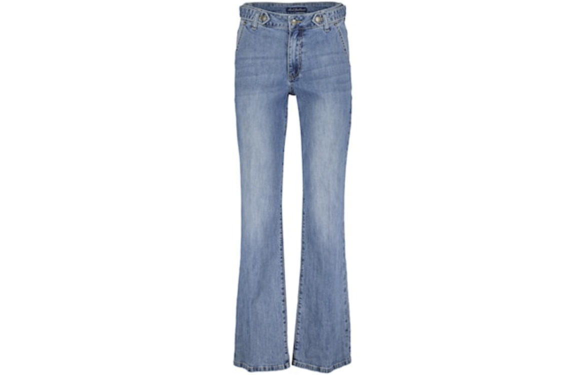 Red Button broek SRB4337. Dit flared model sluit aan de voorzijde door middel van een knoop en rits. Deze blauwe broek van Red Button is aan de voor- en achterzijde voorzien van twee steekzakken.