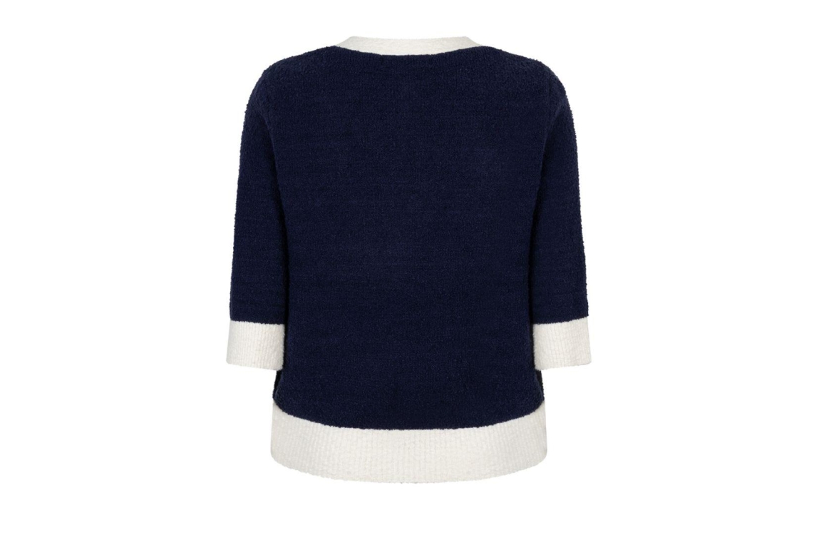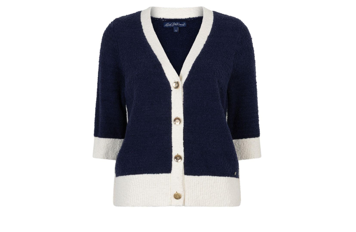 Red Button vest Popcorn SRB4882. Dit rechtvallend model is voorzien van een v-hals en heeft korte mouwen. Deze donkerblauw gebreide vest van Red Button sluit door middel van knopen en is afgewerkt met witte boorden.