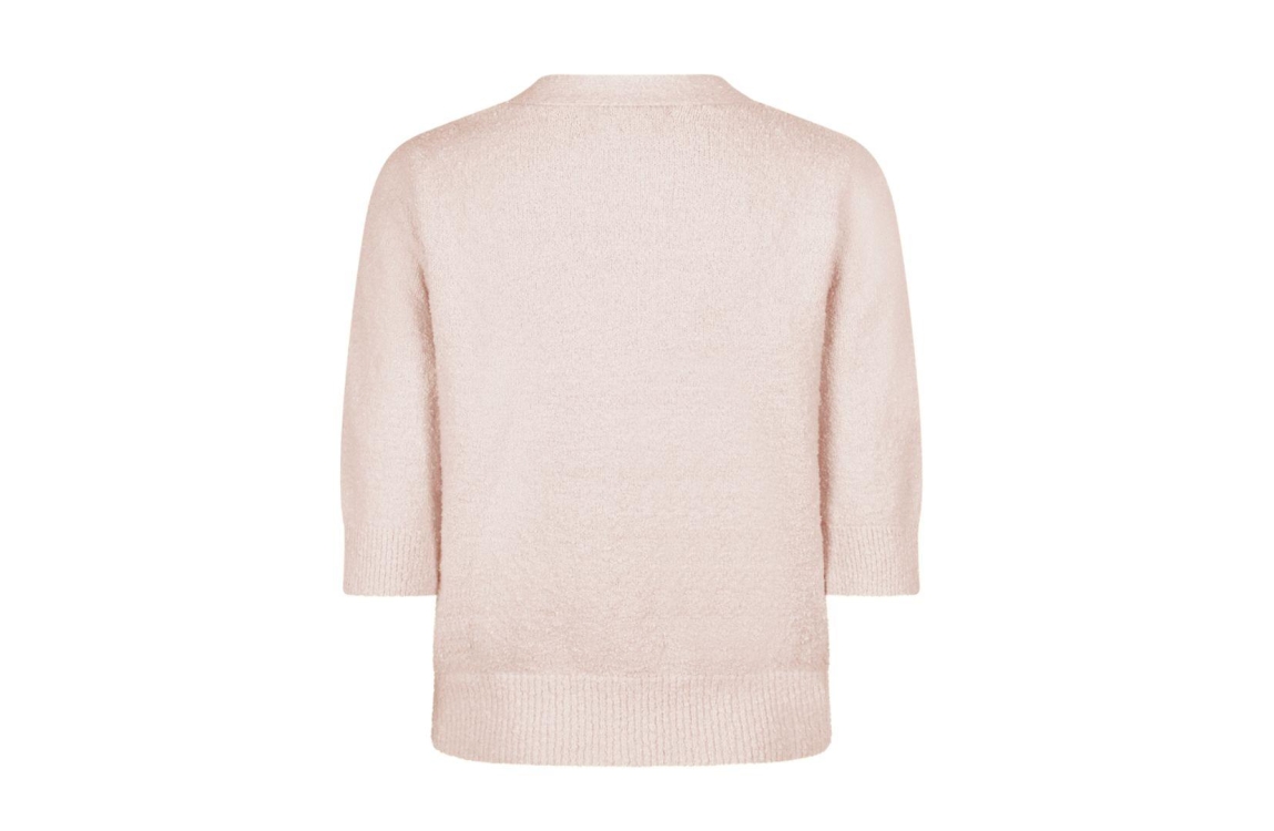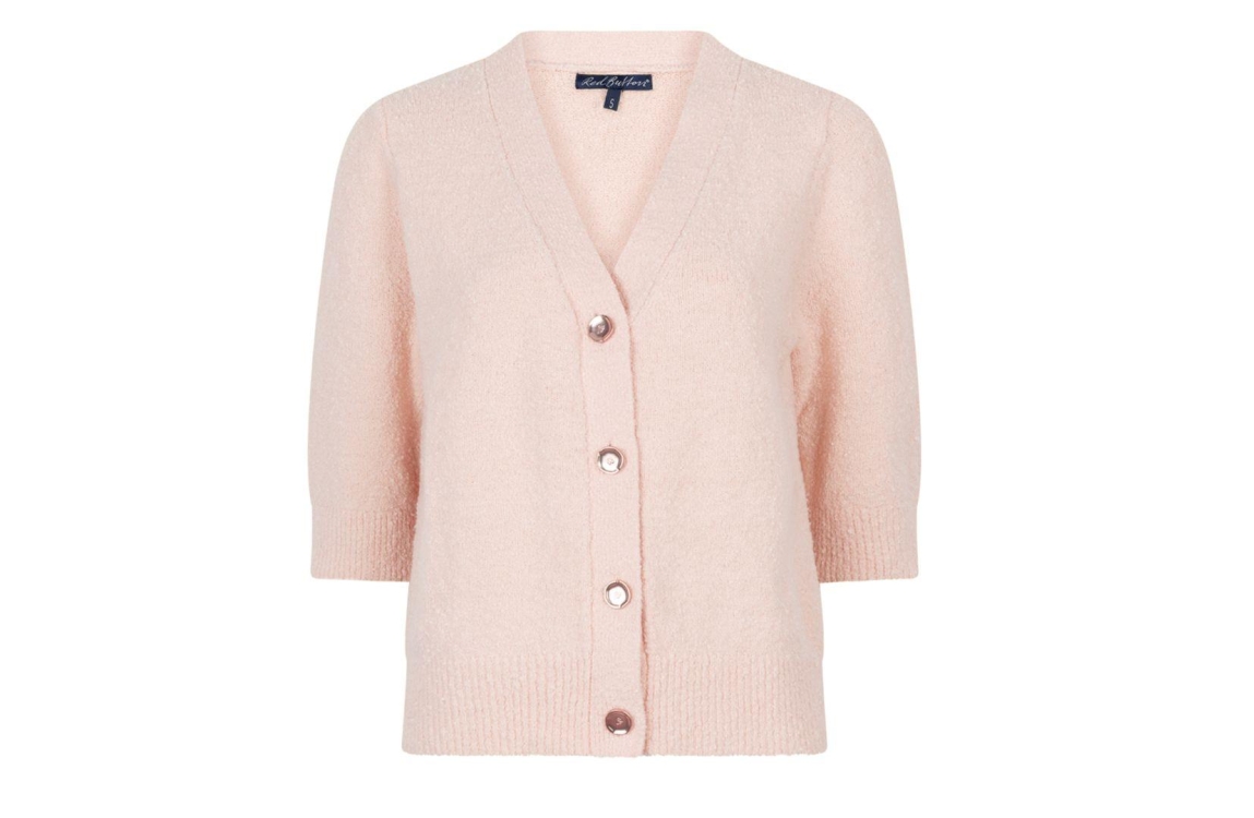 Red Button vest Popcorn SRB4882. Dit rechtvallend model is voorzien van een v-hals en heeft korte mouwen. Deze lichtroze gebreide vest van Red Button sluit door middel van knopen en is afgewerkt met witte boorden.
