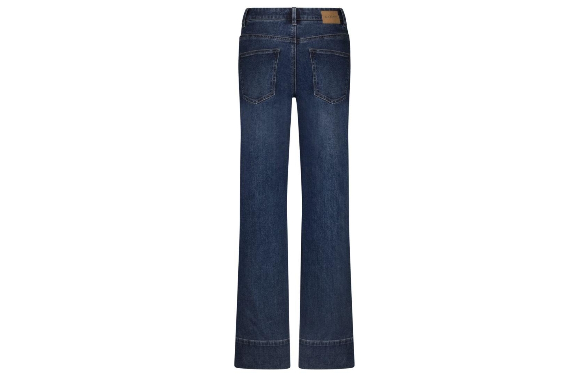 Red Button jeans Claudette SRB4588. Dit wide leg model sluit door middel van een knoop en rits en is afgewerkt met ceintuurlussen. Deze donkerblauwe jeans van Red Button is uitgevoerd in een 5-pocket model en bewerkt met een brede zoom aan de onderzijde.