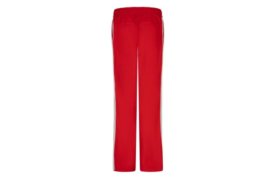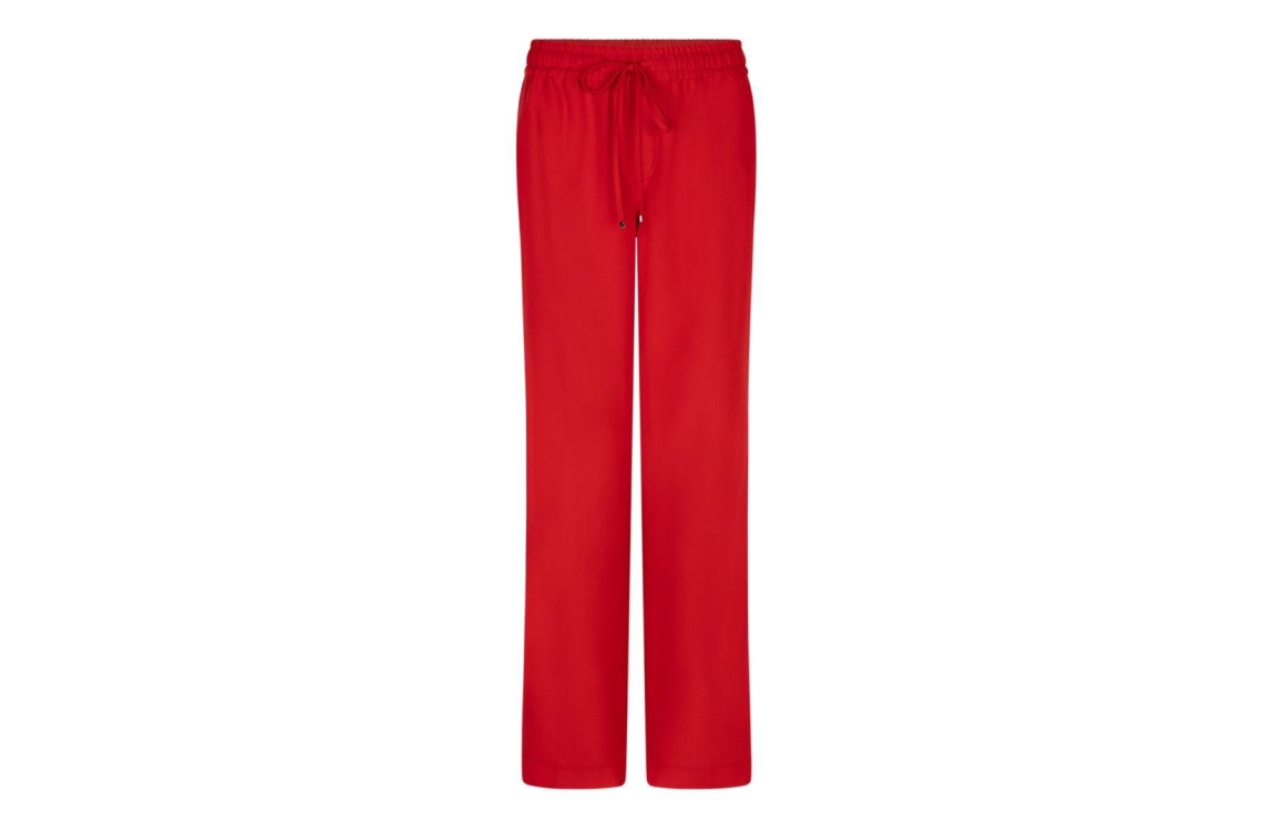 Red Button broek De Claudette Palazzo Sidetape SRB4844A. Dit wide leg model sluit door middel van een elastische boord met trekkoorden en beschikt over twee steekzakken aan de voorzijde en twee paspelzakken aan de achterzijde. Deze rode broek van Red Button is bewerkt met gestreepte biezen aan de zijkanten.