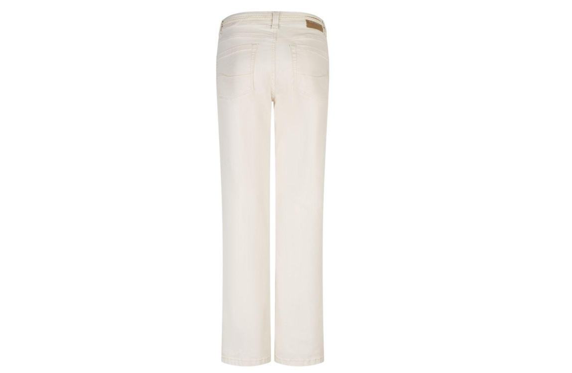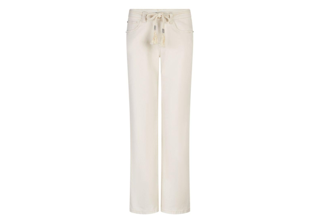 Red Button broek Colette SRB4902 71. Dit wide leg model sluit door middel van een knoop- en ritssluiting en is voorzien van een decoratief gevlochten koord. Deze ecrukleurige broek van Red Button is uitgevoerd in een 5-pocket model en stretchkwaliteit.