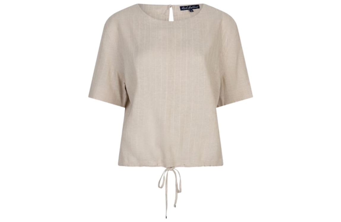 Red Button Skyler top SRB4863. Dit soepelvallend model heeft een ronde hals, korte mouwen en sluit aan de achterzijde door middel van een knoopje. Deze beige gestreepte top van Red Button is aan de onderzijde afgewerkt met een trekkoord.