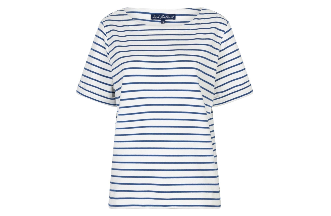 Red Button De Terry Stripe Short Sleeve is een 332 Jeans blue. Dit rechtvallende model is voorzien van een ronde hals en korte mouwen. Deze witte top van Red Button is bewerkt met horizontale blauwe strepen.