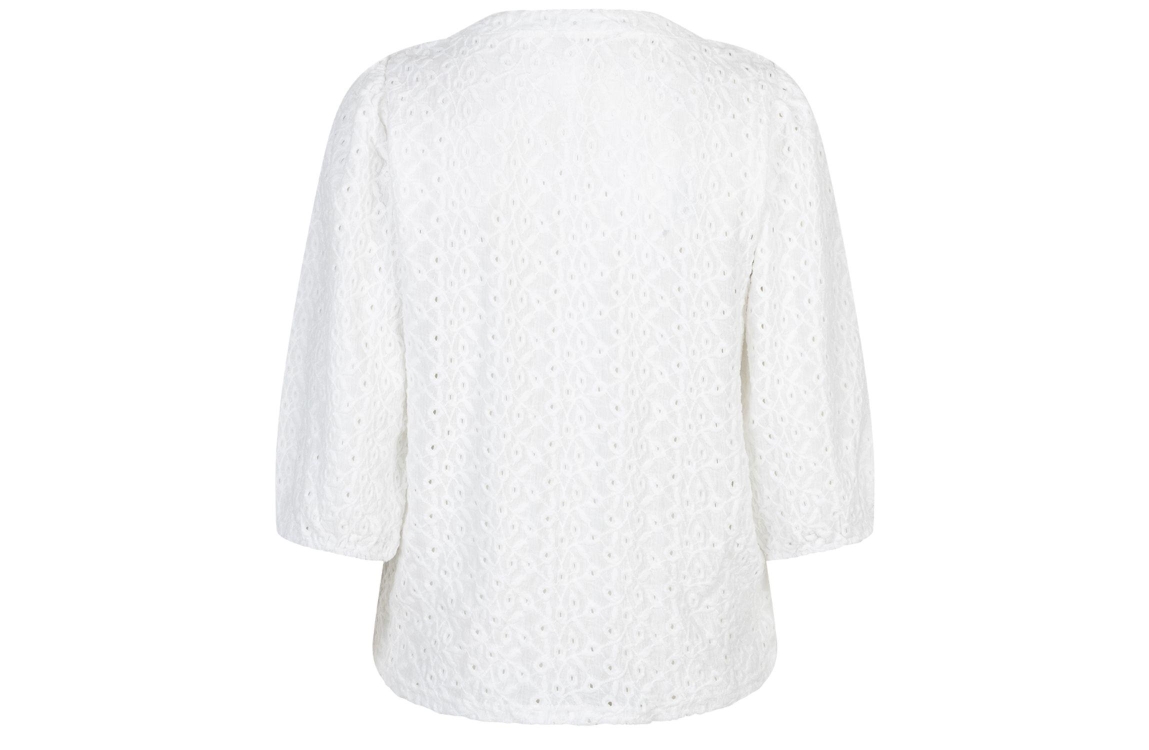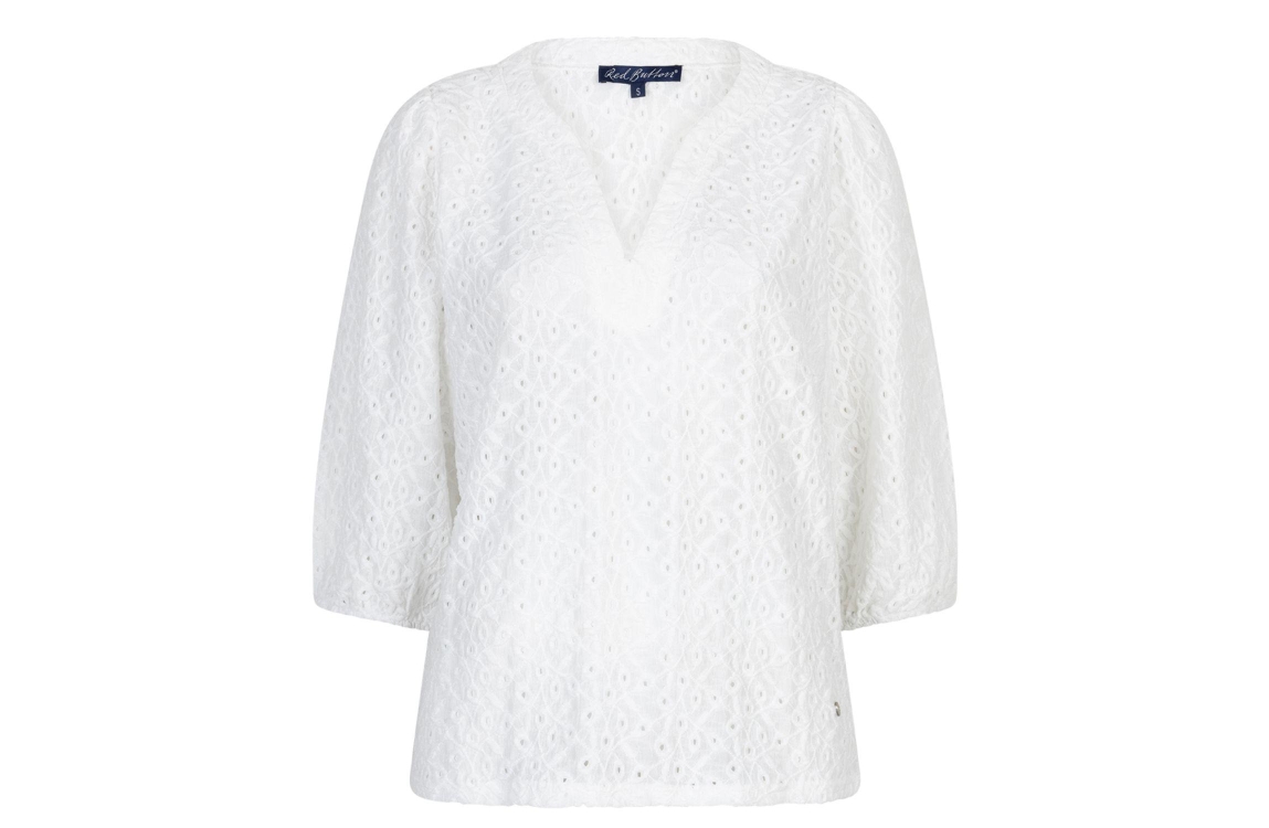 Red Button De Top Ajour is gemaakt van broderi 38 Offwhite. Dit rechtvallende model is voorzien van een v-hals en heeft driekwart ballonmouwen met elastiek aan het uiteinde van de mouw. Deze off-white top van Red Button is gemaakt van broderie.