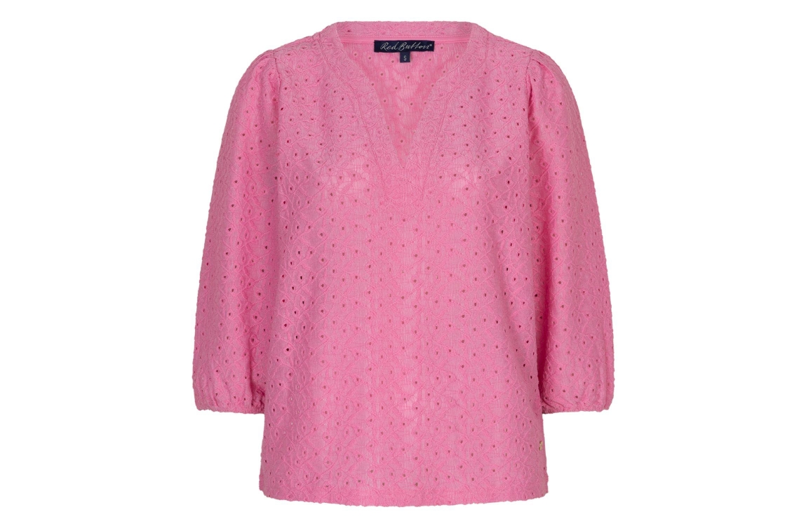 Red Button De Top Ajour is gemaakt van broderi 42 Pink. Dit rechtvallende model is voorzien van een v-hals en heeft driekwart ballonmouwen met elastiek aan het uiteinde van de mouw. Deze roze top van Red Button is gemaakt van broderie.