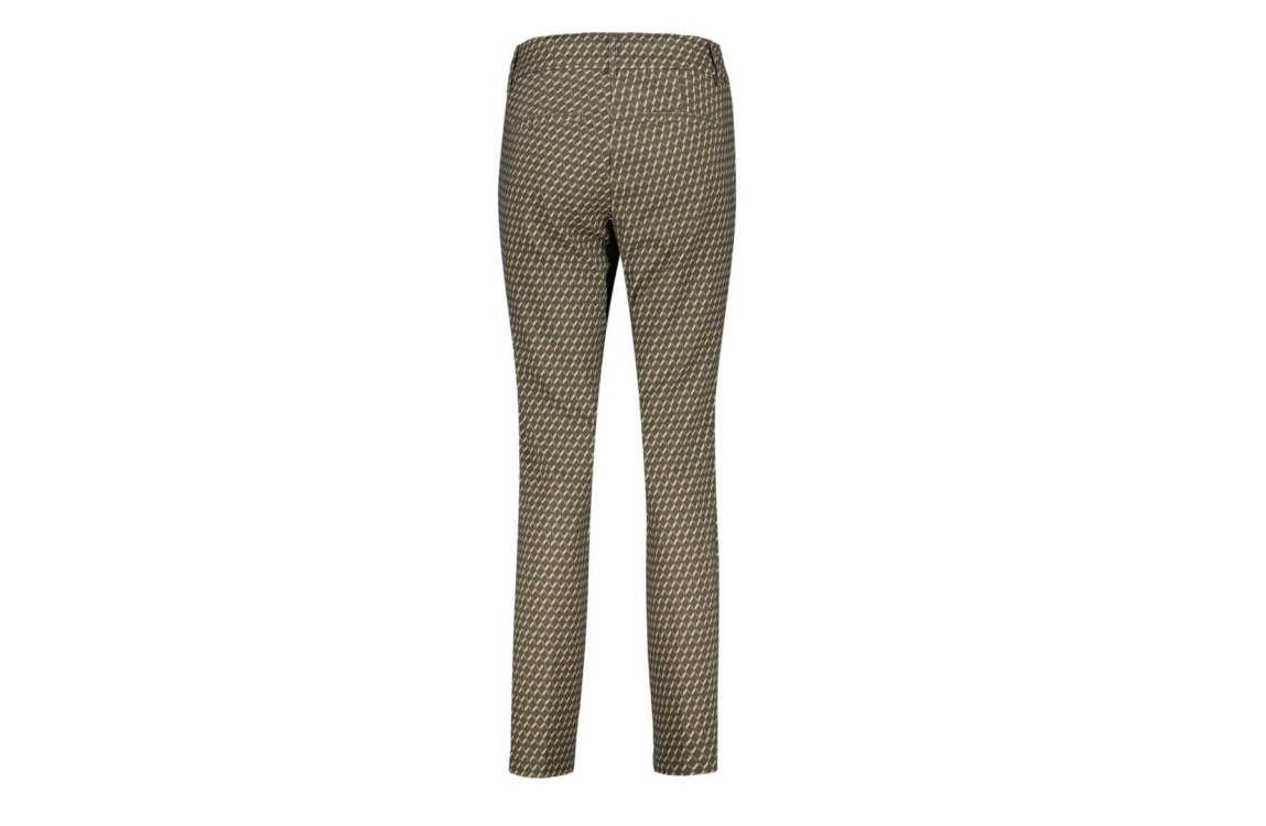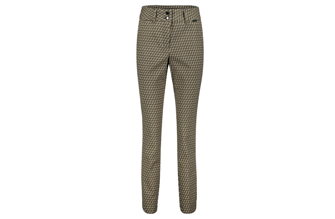Red Button broek Diana SRB4389. Dit aangesloten model sluit door middel van knopen en rits afgewerkt met ceintuurlussen. Deze groene broek van Red Button beschikt over twee steekzakken en is bewerkt met een bruine print.