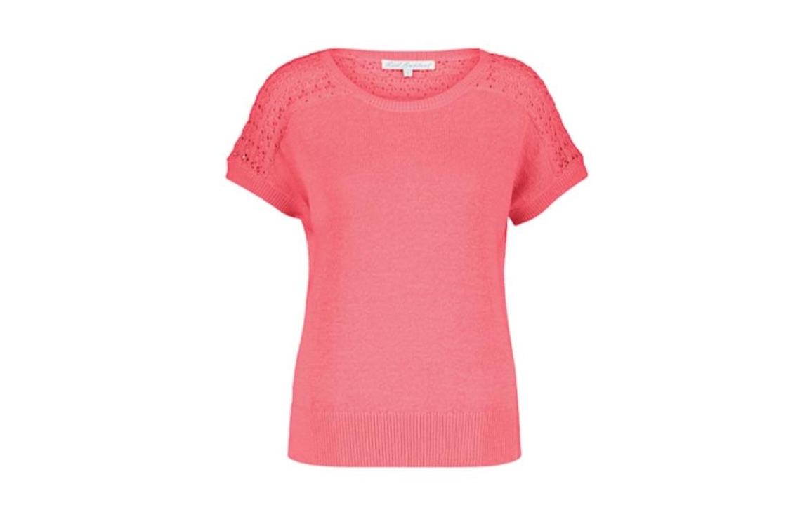 Red Button Jerry top. Dit rechtvallend model is voorzien van een ronde hals en heeft korte mouwen. Dit coral kleurig model van Red Button heeft een open gewerkte schouderpas en is afgewerkt met ribgebreide boorden.
