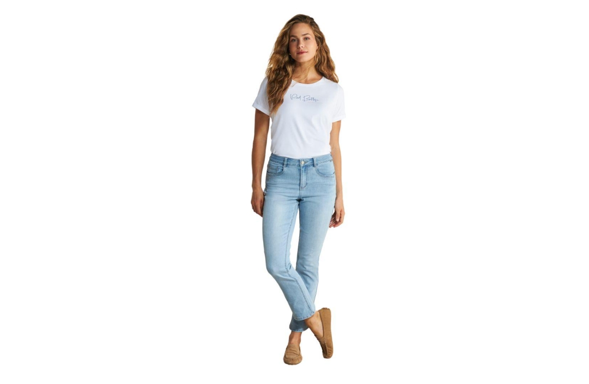 Red Button jeans SRB3823. Dit rechtvallend model sluit door middel van een knoop en rits afgewerkt met ceintuurlussen. Deze jeans van Red Button is uitgevoerd in een 5-pocket model.