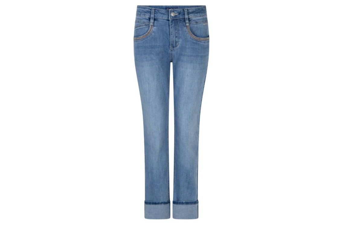 Red Button broek SRB4788 220. Dit regular fit model sluit door middel van een knoop- en ritssluiting en is voorzien van ceintuurlussen. Deze denim broek van Red Button is uitgevoerd in een 5-pocket model en is afgewerkt met een bruinkleurige patch aan de achterzijde. De twee zakken aan de voorzijde zijn gedetailleerd met kraaltjes en draden.