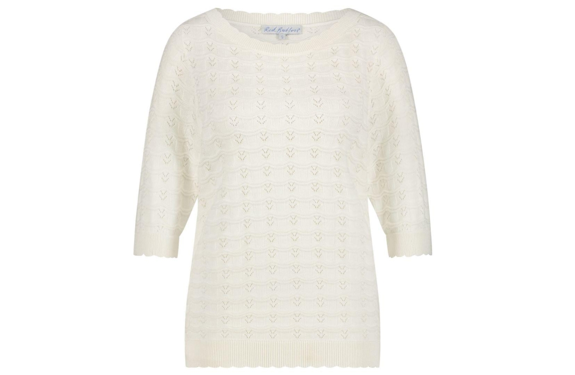 Red Button pullover SRB4494. Dit rechtvallend model is voorzien van een ronde hals en heeft korte mouwen afgewerkt met een kartelrand. Deze offwhite pullover van Red Button is bewerkt met een golvende structuur.