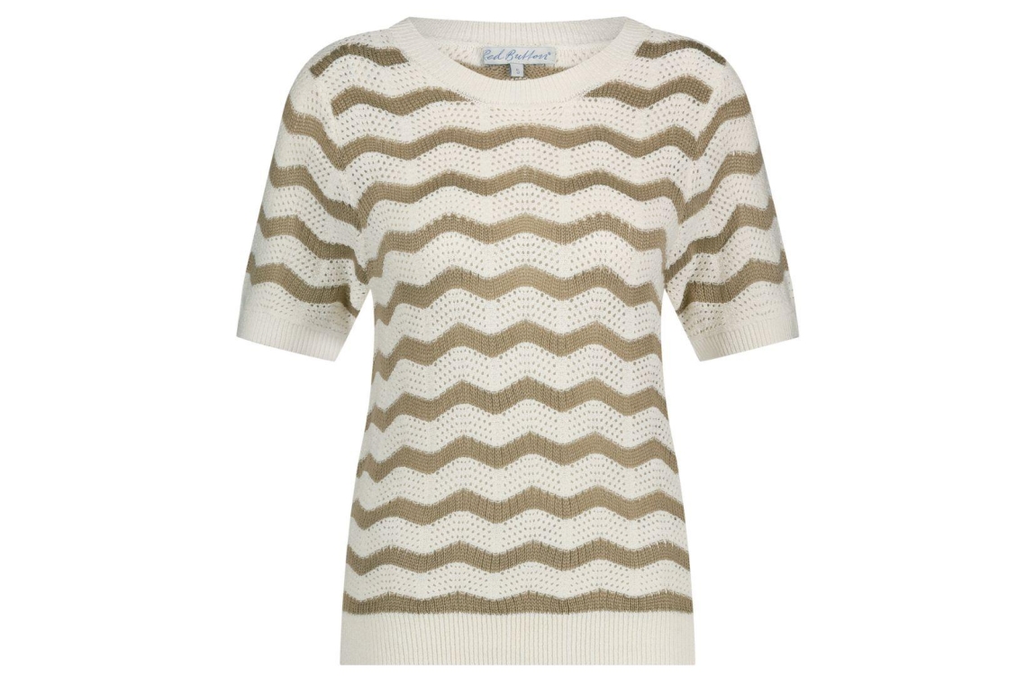 Red Button pullover SRB4516. Dit rechtvallend model is voorzien van een ronde hals en heeft korte mouwen. Deze witte/beige pullover van Red Button is bewerkt met een zigzag structuur.