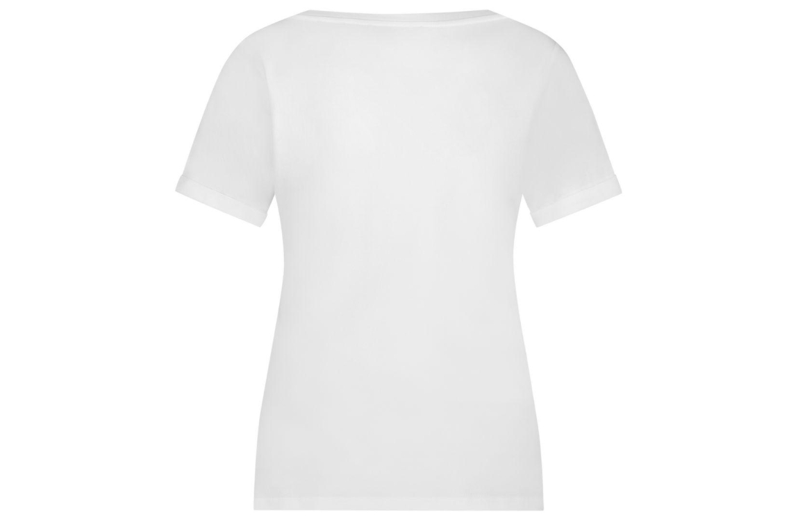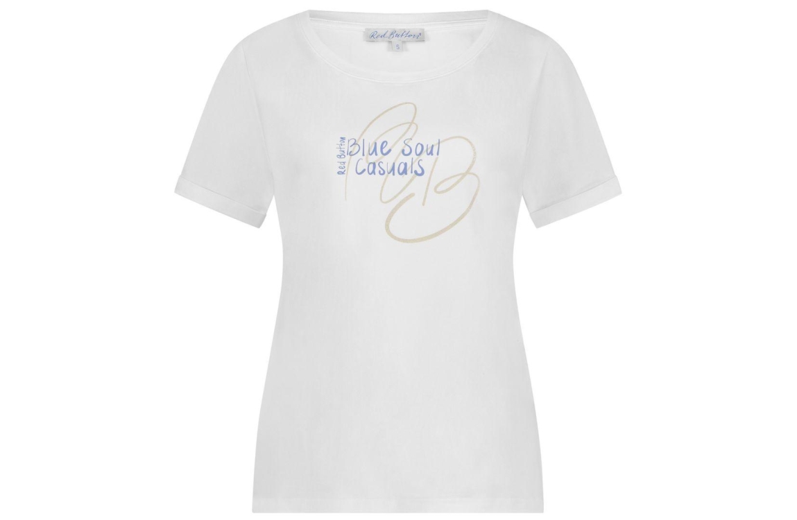 Red Button T-shirt SRB4470. Dit rechtvallend model is voorzien van een ronde hals en heeft korte mouwen. Deze witte T-shirt van Red Button is aan de voorzijde bewerkt met een blauwe tekstopdruk.